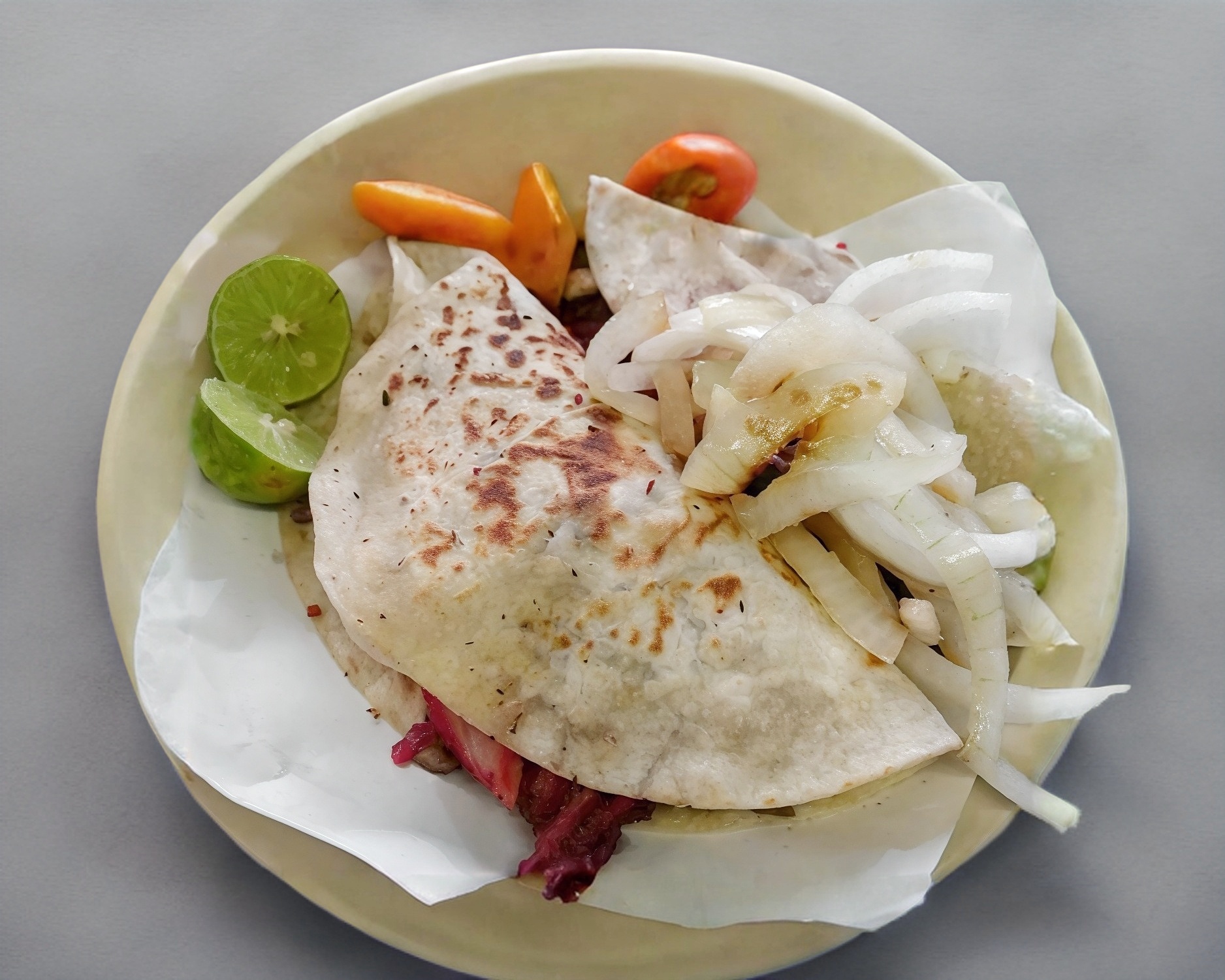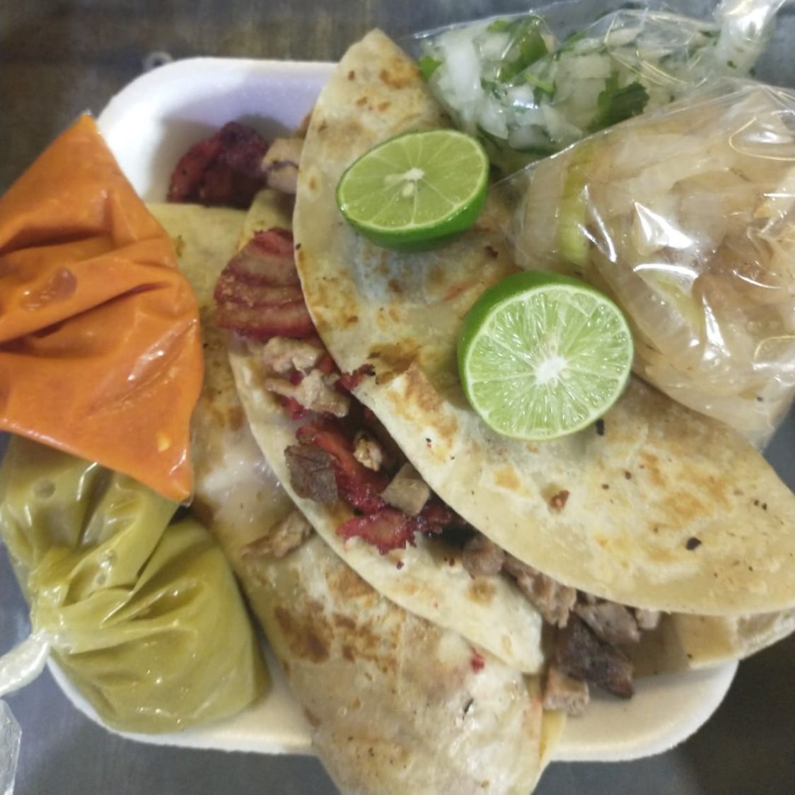 Carne de trompo, carne de bistec, queso asadero, limones, cebolla cocida y cebolla con cilantro, salsa roja y verde en tortilla de harina.