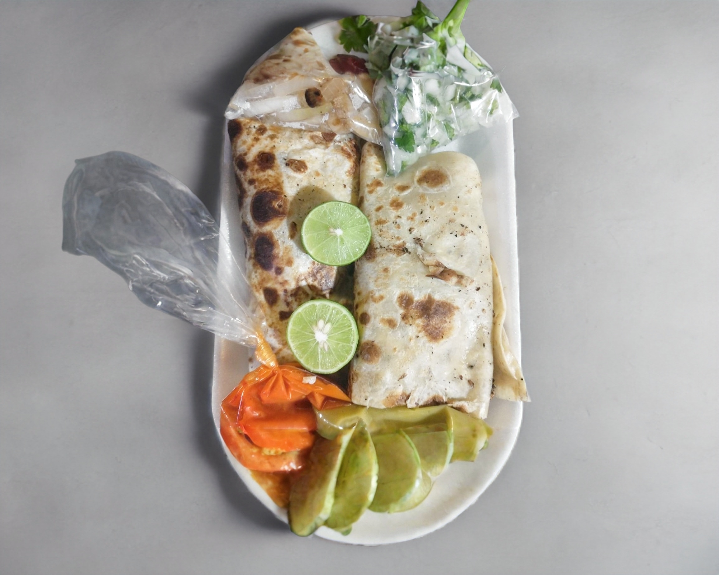 Carne de trompo, queso asadero con aguacate en tortilla de harina tamaño burrito.
