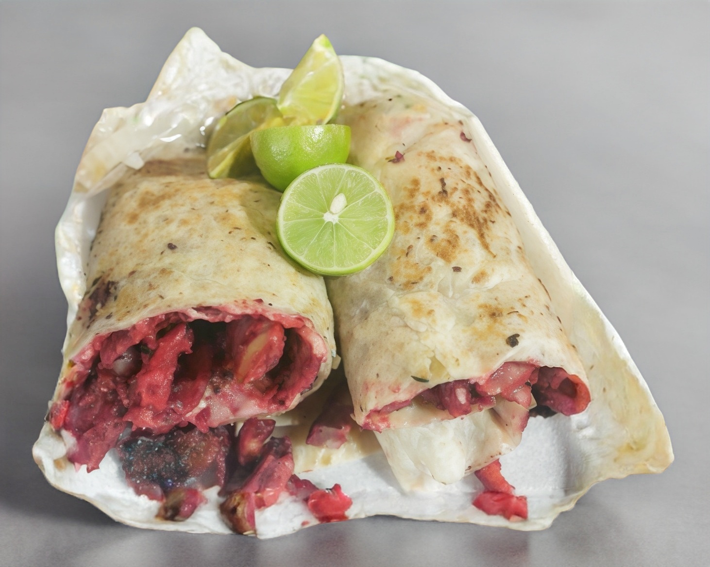 Carne de trompo 200gr, carne de bistec 150gr, queso asadero, limones, cebolla cocida y cebolla con cilantro, salsa roja y verde en tortilla de harina.