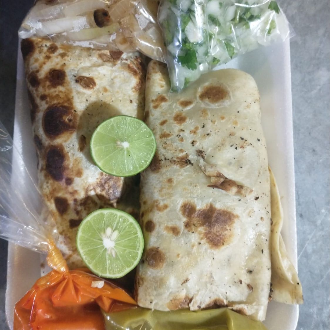 Carne de bistec, queso asadero, limones, cebolla cocida, cebolla con cilantro, salsa verde y roja en tortilla de harina.