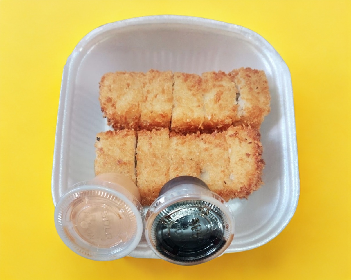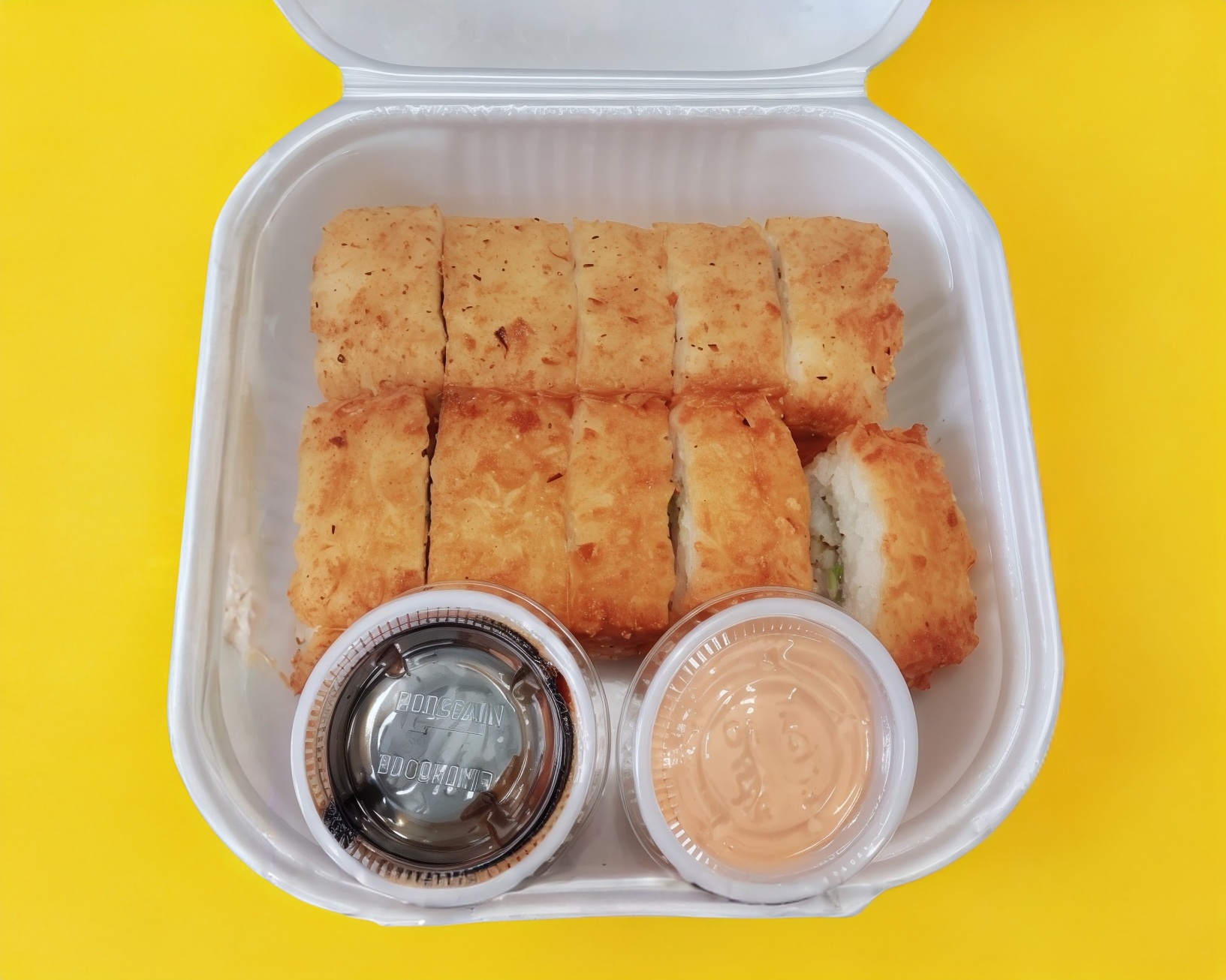 CAMA DE ARROZ POR DENTRO, 3 CAMARONES EMPANIZADOS , AGUACATE, QUESO PILADELPHIA, INCLUYE SALSA DULCE Y ADEREZO CHIPOTLE.