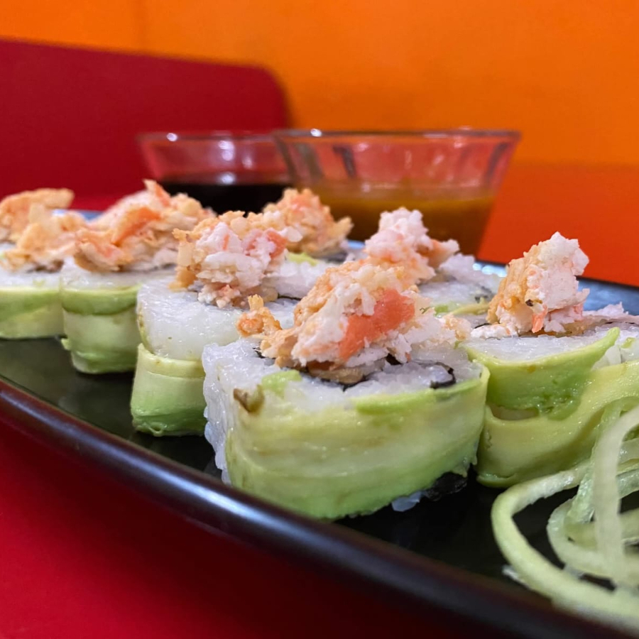 CAMA DE ARROZ POR FUERA, 3 CAMARONES, QUESO PHILADELPHIA, PEPINO RALLADO, CON CAPAS DE AGUACATE POR FUERA, INCLUYE SALSA DULCE Y ADEREZO CHIPOTLE