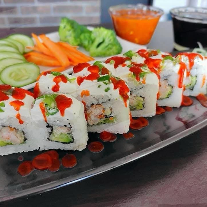 CAMA DE ARROZ POR FUERA, 3 CAMARONES, AGUACATE, PEPINO RALLADO, QUESO PHIILADELPHIA POR FUERA, RODAJAS DE CHILE SERRANO, CON DECORACION DE SIRACHA, INCLUYE SALSA DULCE Y ADEREZO CHIPOTLE
