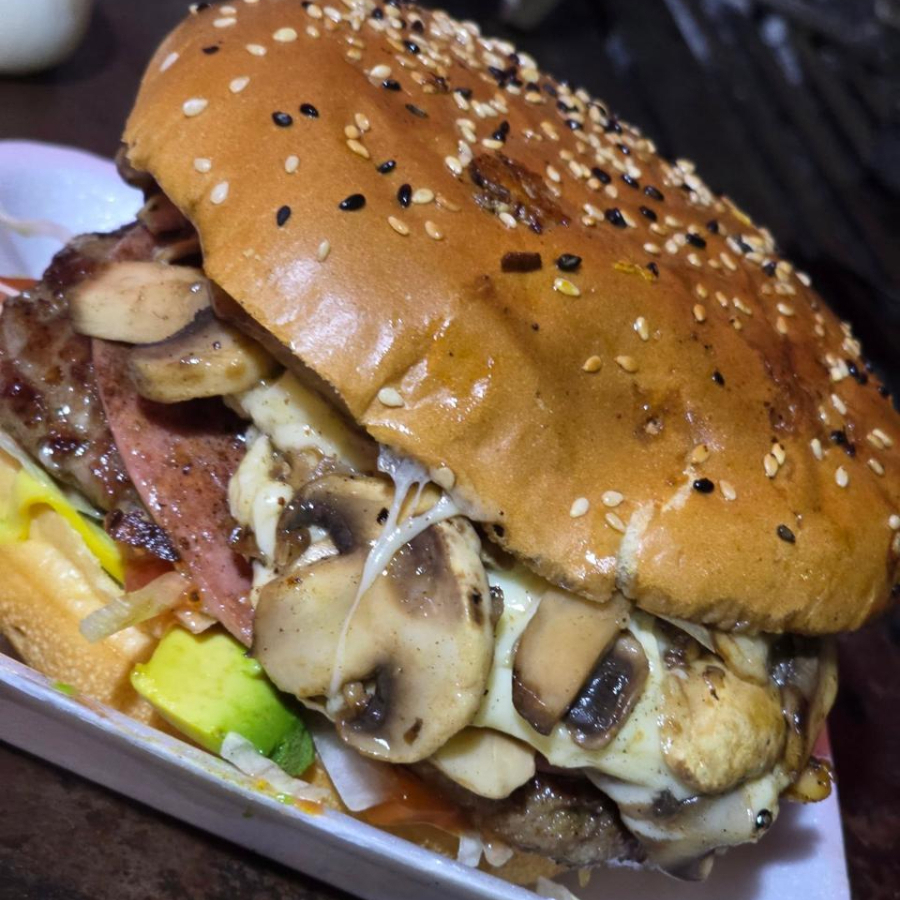 200 gramos de carne, jamón y queso, en la tapa champiñónes con queso, pan Parrilero, aderezos, aguacate y lechuga.