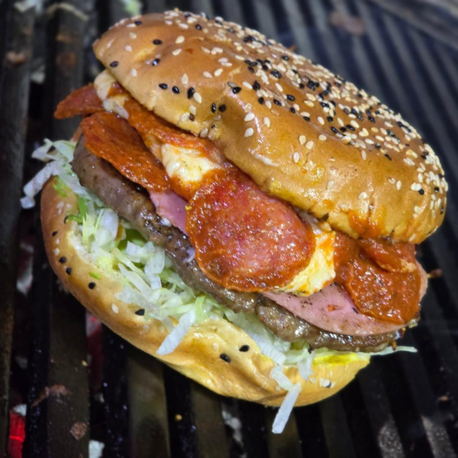 200 gramos de carne, jamón y queso, en la tapa salsa de tomate, queso y peperoni, pan Parrilero, aderezos, aguacate y lechuga.