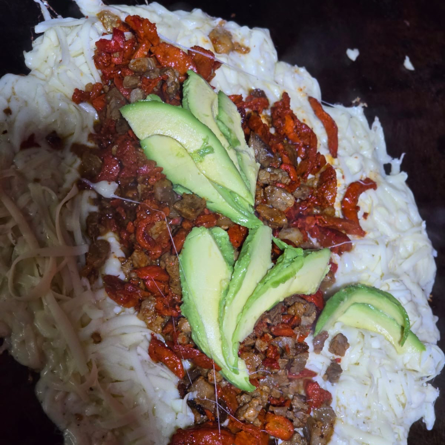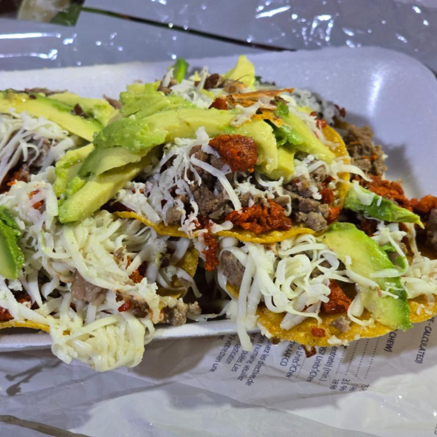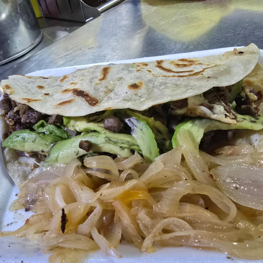 tortilla taquera tostada con carne queso y aguacate.