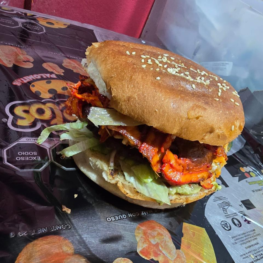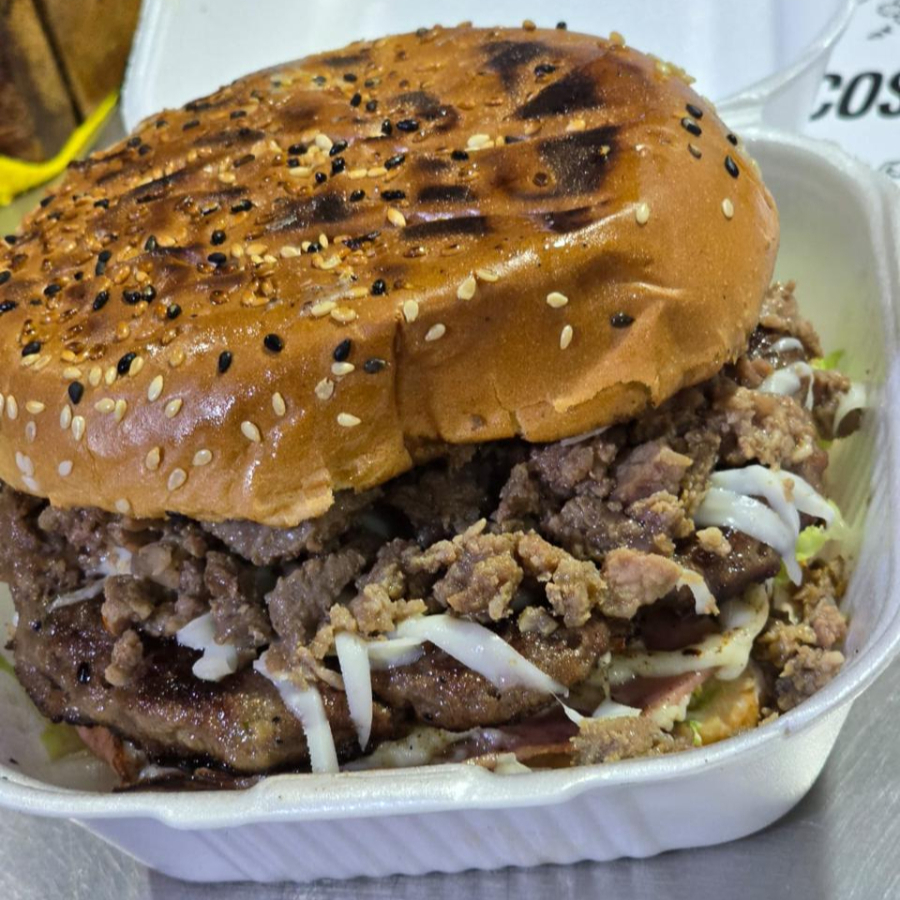 200 gramos de carne, jamón y queso, trompo y bistec, pan Parrilero, aderezos, aguacate y lechuga.