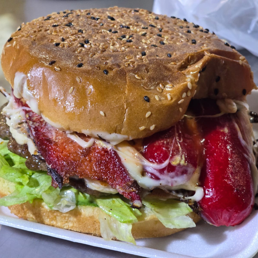 200 gramos de carne, jamón y queso, rebanadas de tocino, pan Parrilero, aderezos, aguacate y lechuga.