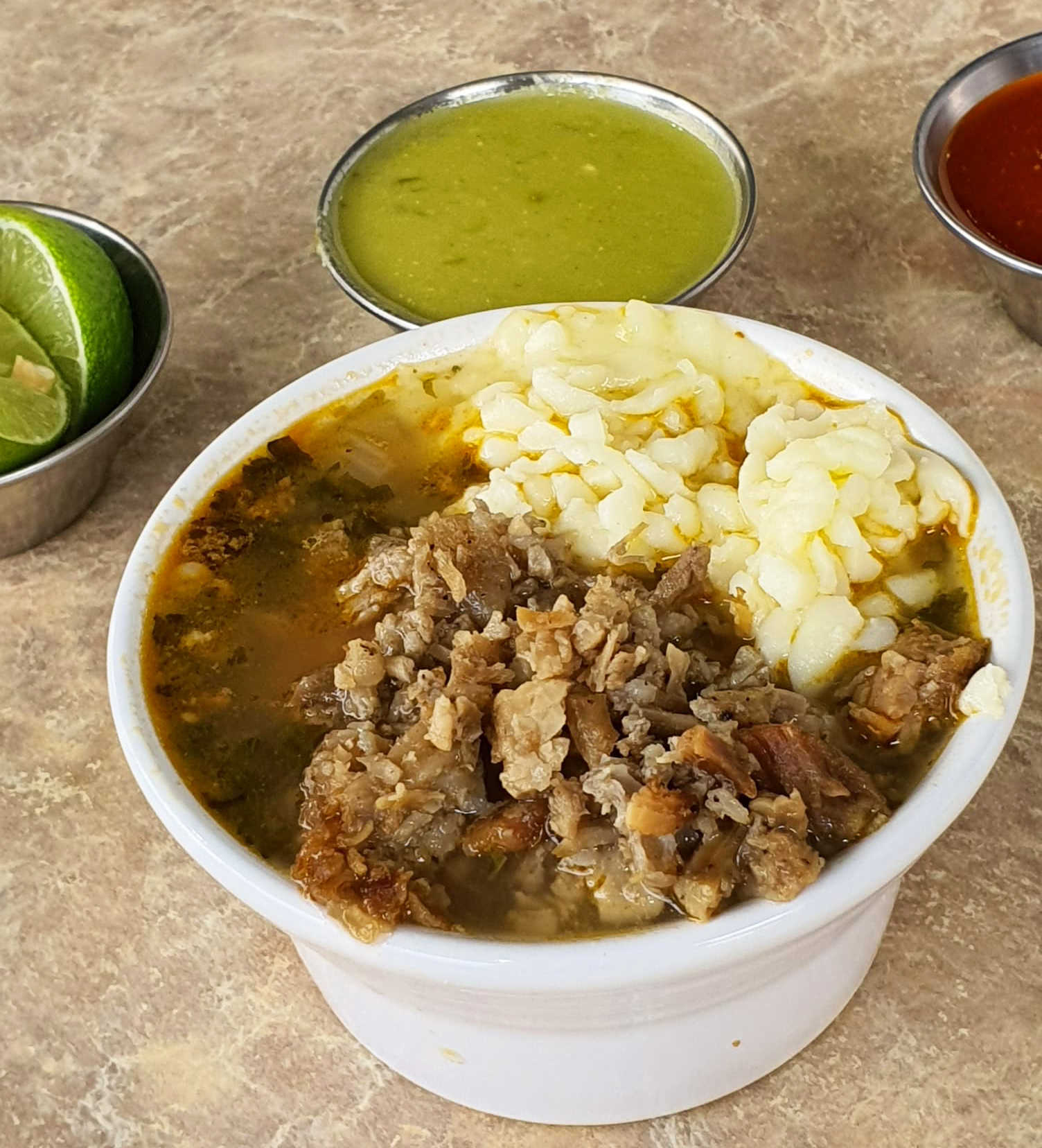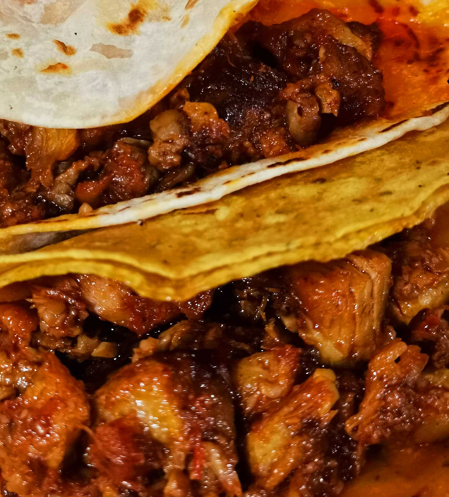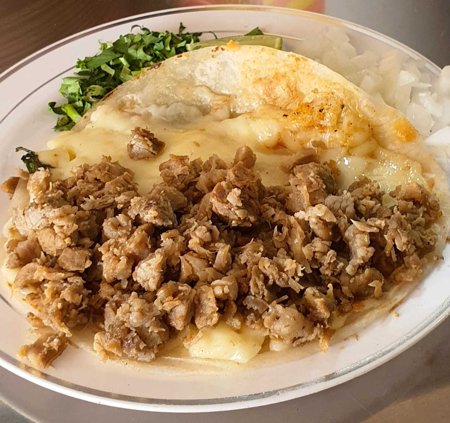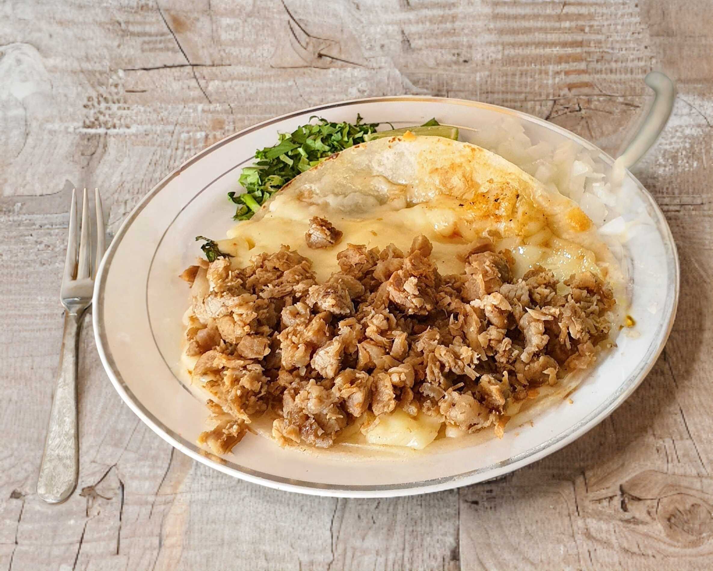 Plato persona/ 1 Tortilla de harina de 15 cm. con queso asadero y rica mezcla de bistec y trompo/ cilantro, salsa y limón