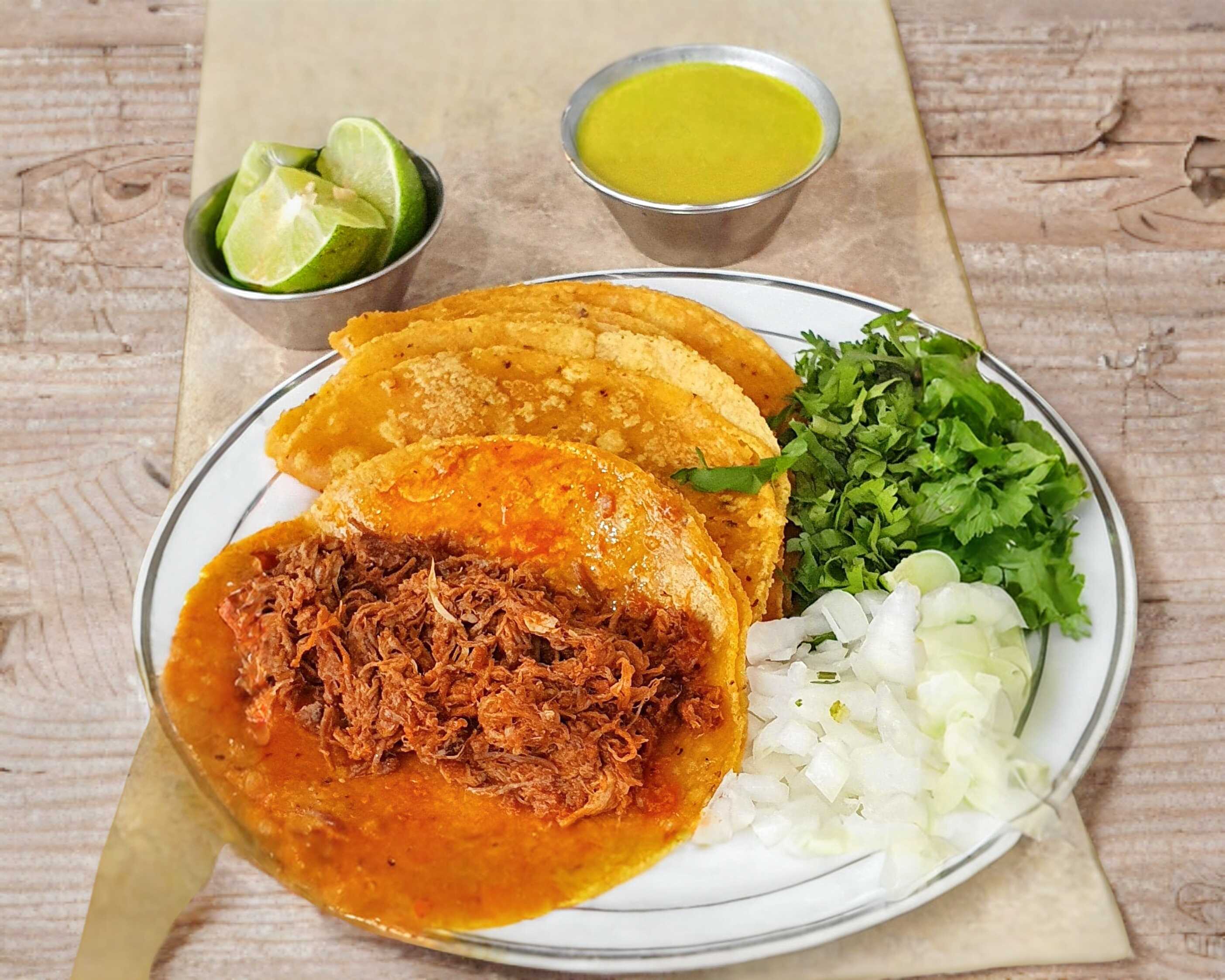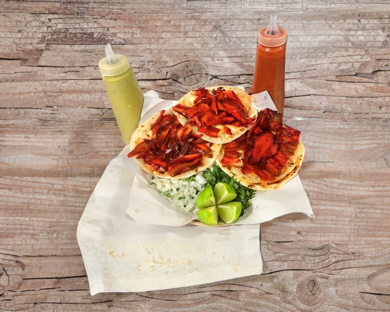 Rico bistec sazonado, puede servirse en tortilla de harina o de maíz. Acompañado de salsas y verduras (cebolla y cilantro) por aparte.