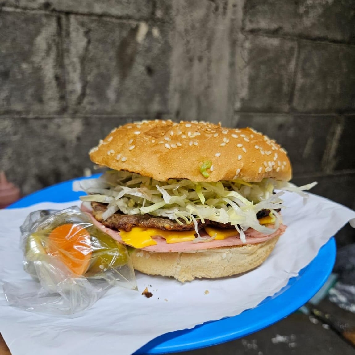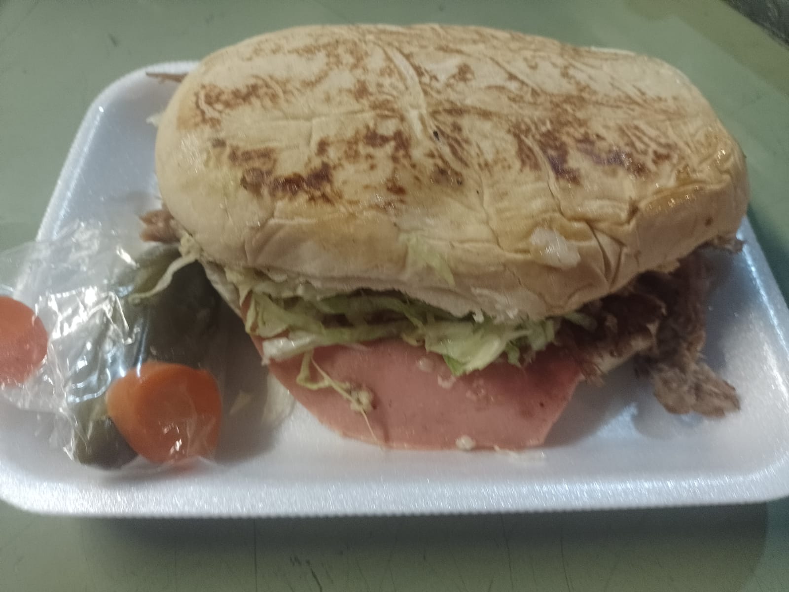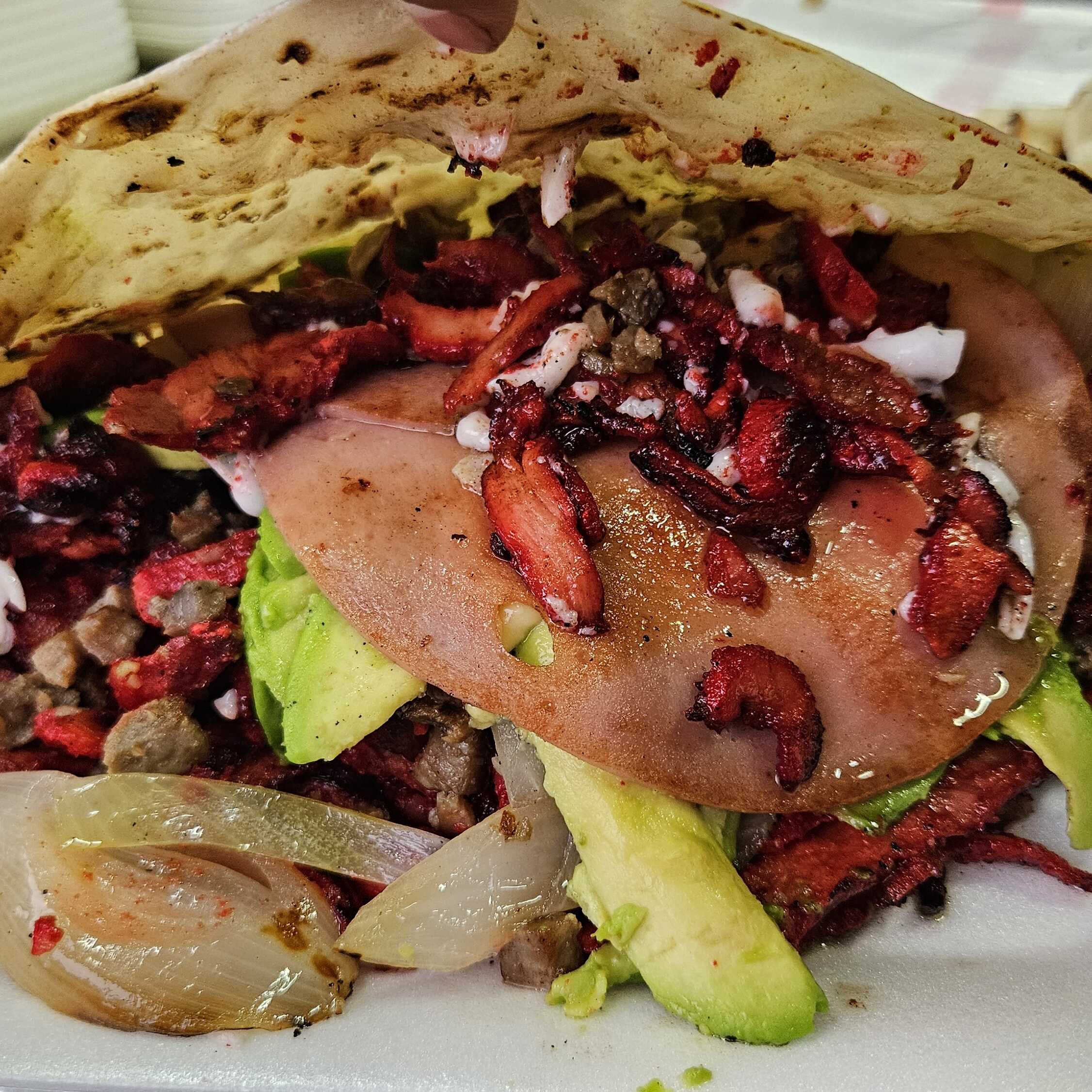 Teleta, con mayonesa, frijoles molidos, lechuga, aguacate, crema, jamón, queso asadero y bistec.