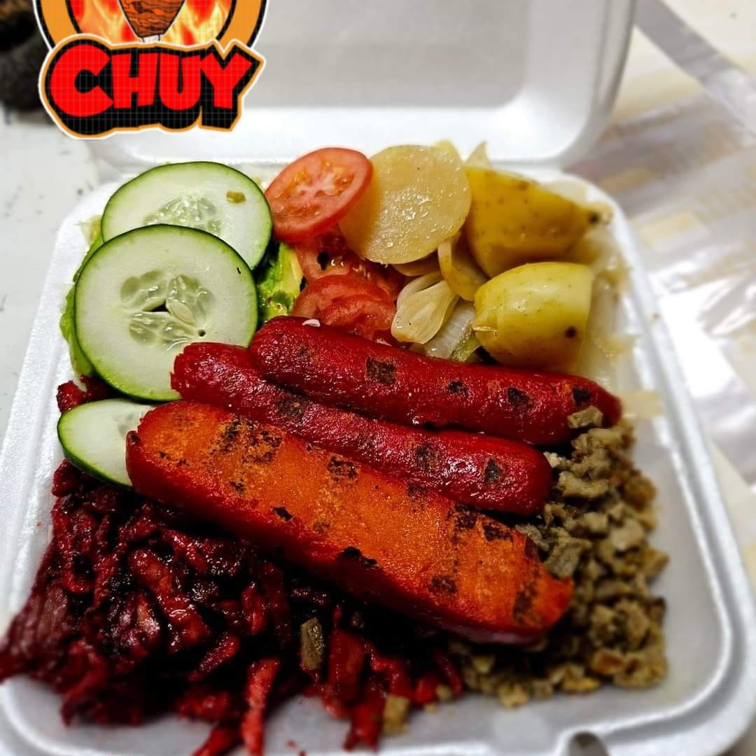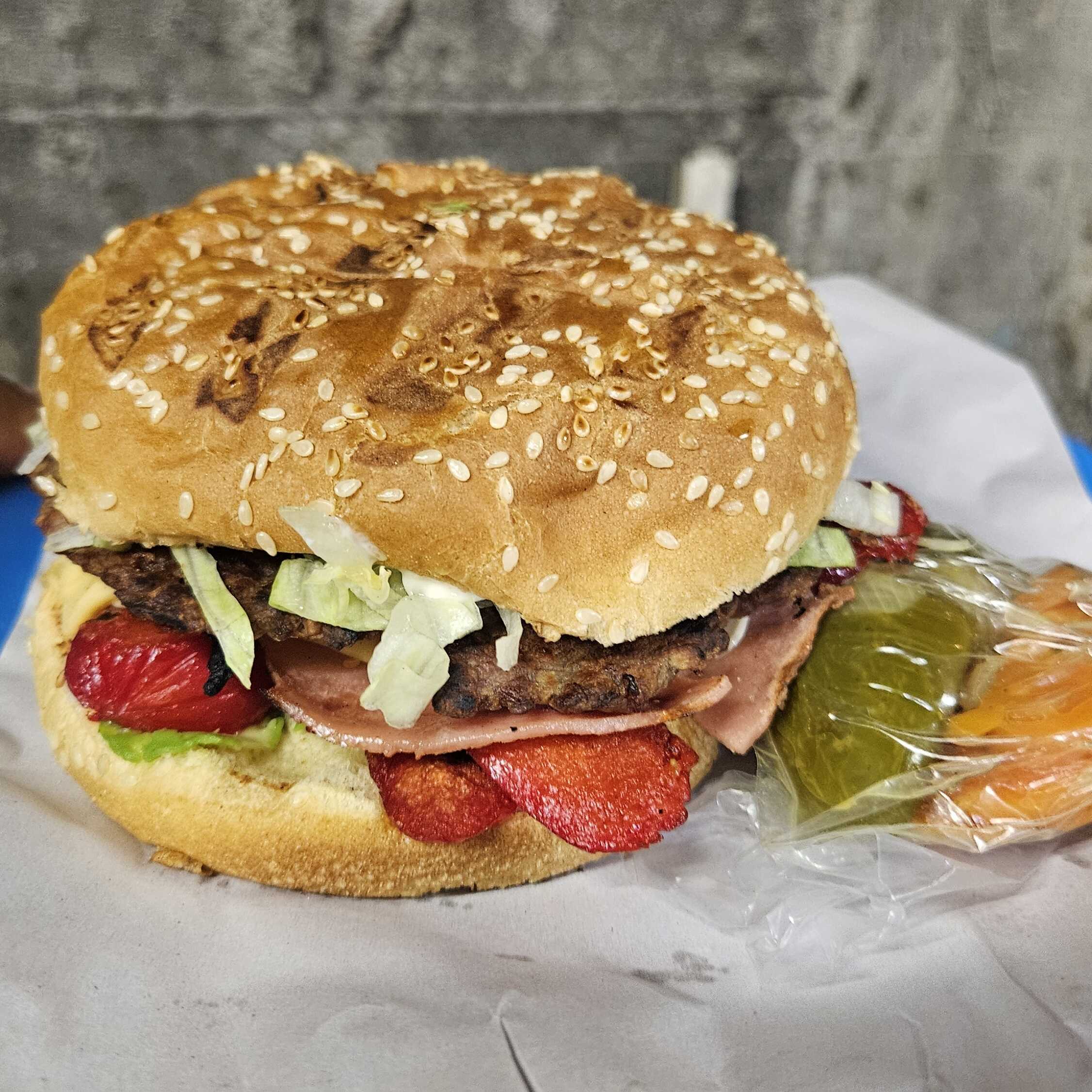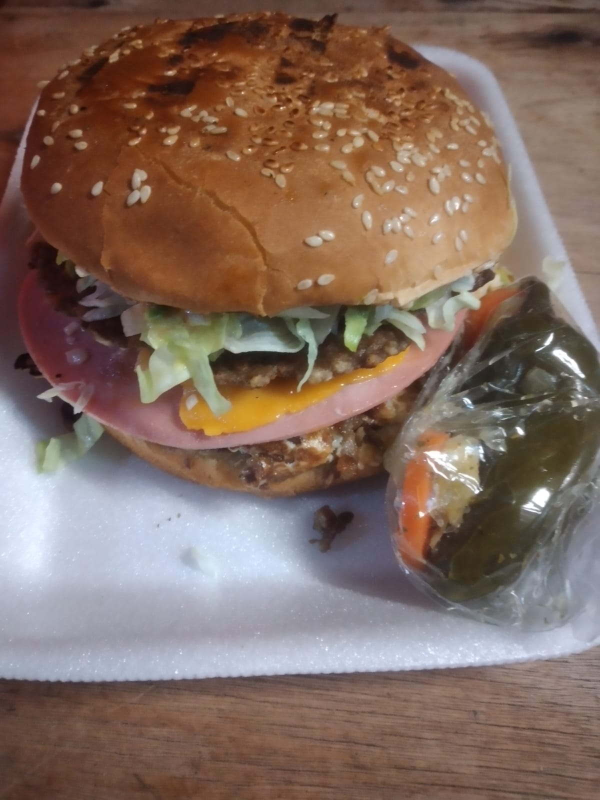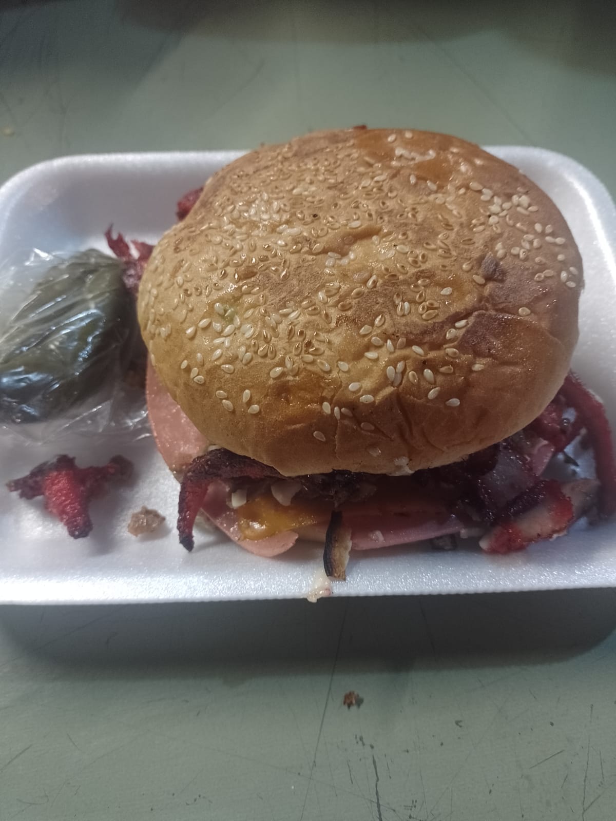 Teleta, con mayonesa, frijoles molidos, lechuga, aguacate, crema, jamón, queso asadero y bistec.