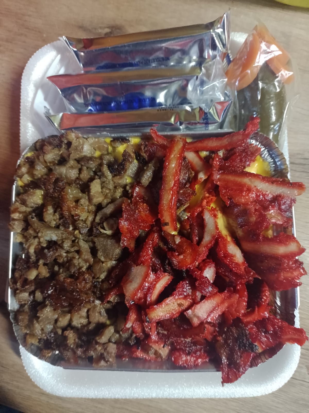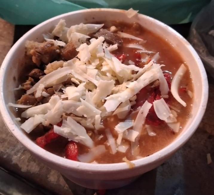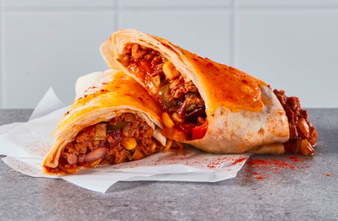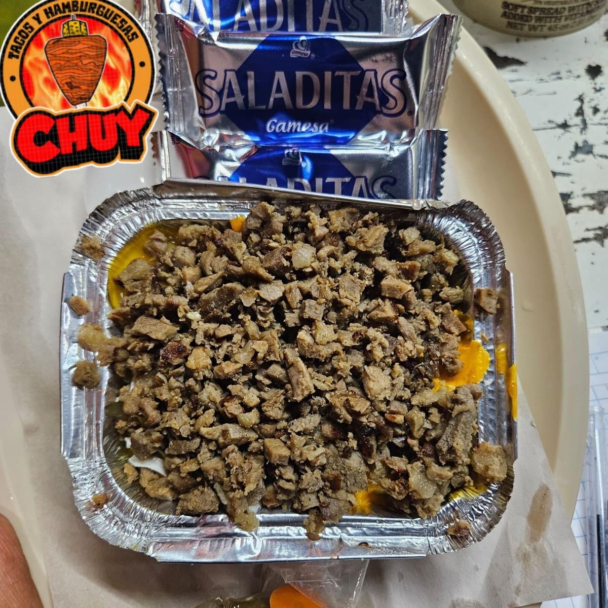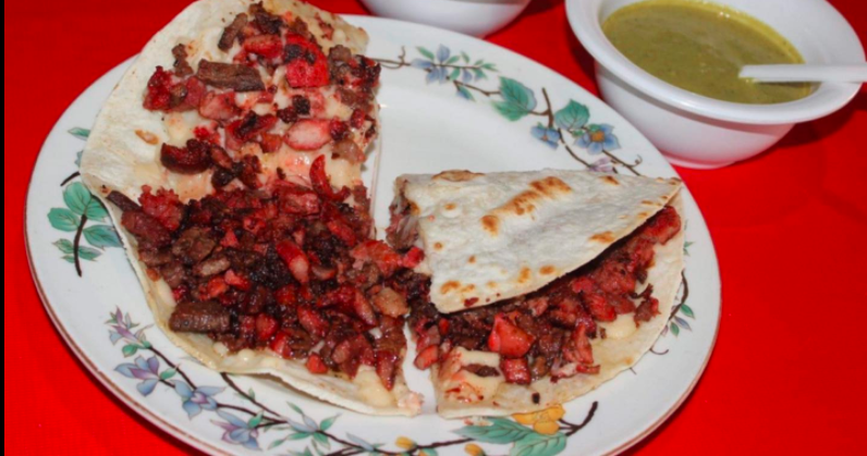 Tortilla de harina rellena de carne campechana (trompo y bistec), queso asadero, por separado salsa verde y roja, cebolla y cilantro.