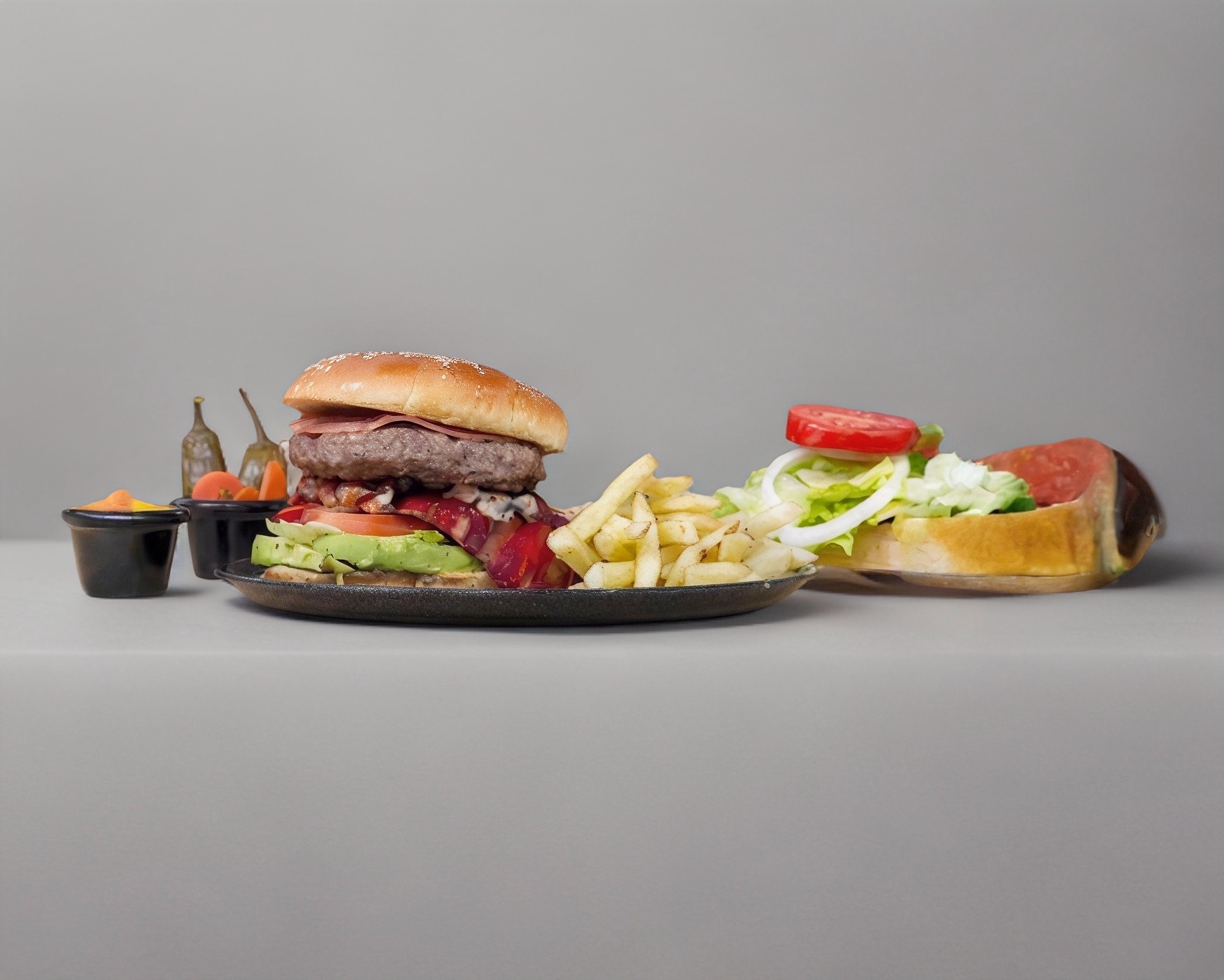 200 gramos de carne prime, 150 gramos de bistec y queso asadero gratinado, complementados con aguacate, lechuga, cebolla, tomate, mayonesa y mostaza. Acompañado de 130 gramos de nuestras deliciosas papas fritas.