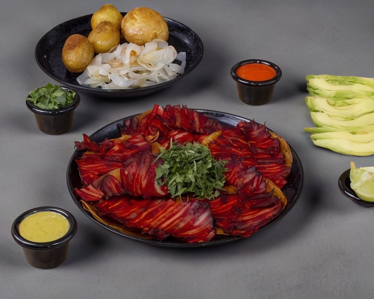 2 piezas de carne de bistec y 3 piezas de trompo con nuestra deliciosa receta, queso asadero gratinado y aguacate. Acompañado de salsa roja y verde, limones, cilantro, cebolla y papitas de Galeana.