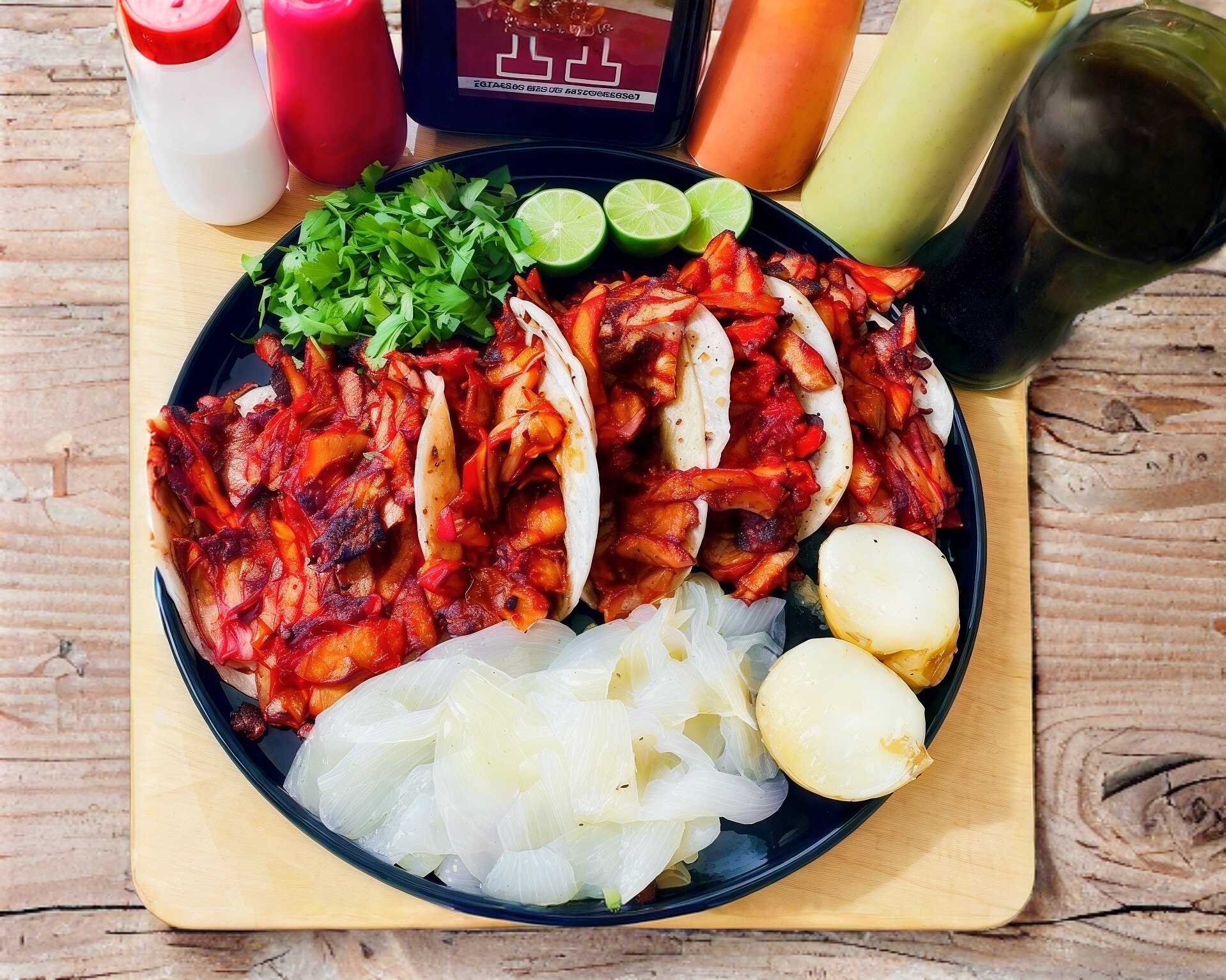 Carne de Trompo con nuestra Exclusiva Receta y Queso Asadero Gratinado Acompañado de salsa roja, Verde, limones, Cilantro, Cebolla y Papitas de Galeana