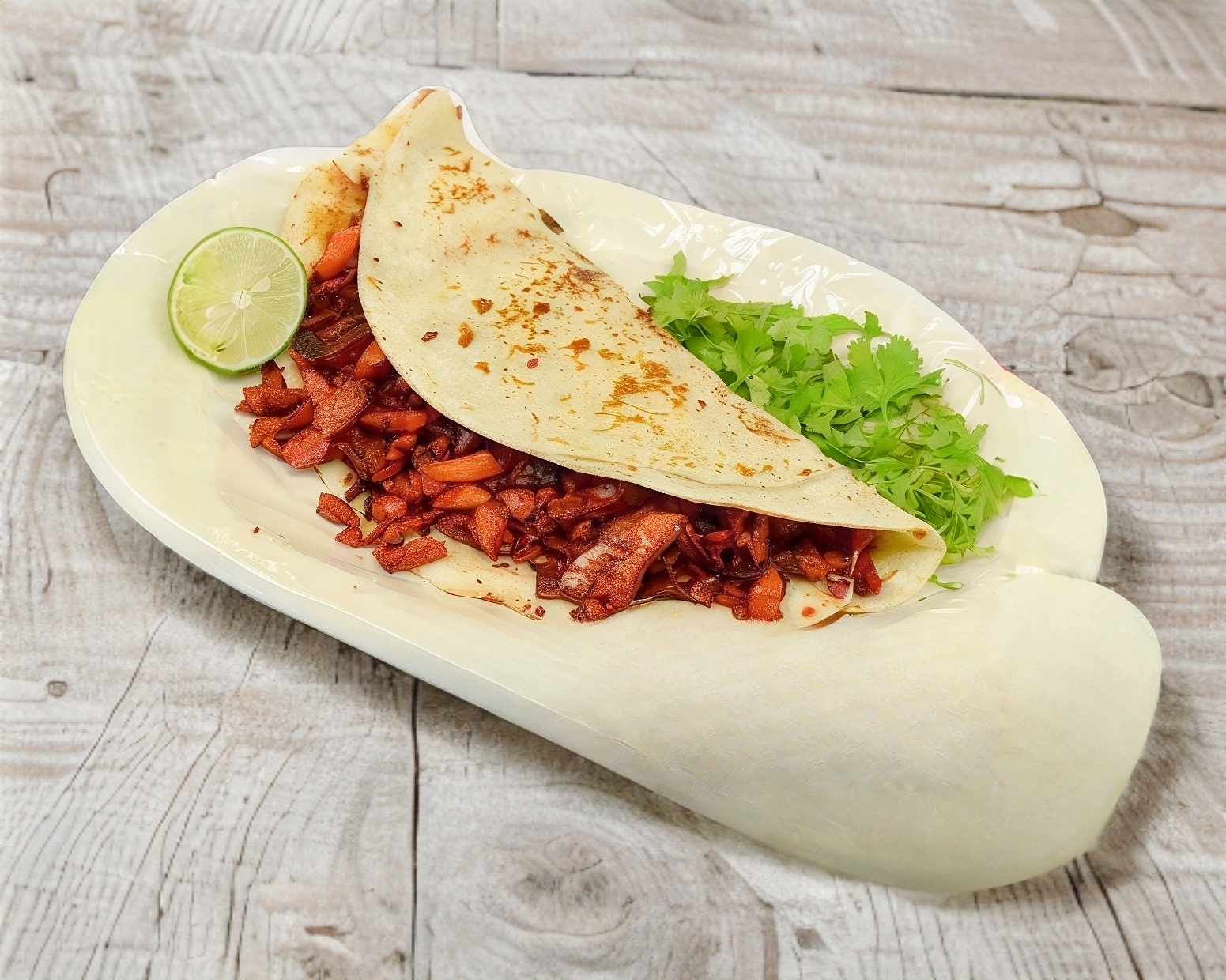 5 Taquitos en Harina con nuestra Deliciosa Carne de Trompo Queso Asadero Gratinado. Acompañado de Salsa Roja y Verde, Limones, Cilantro , Cebolla y Papitas de Galeana