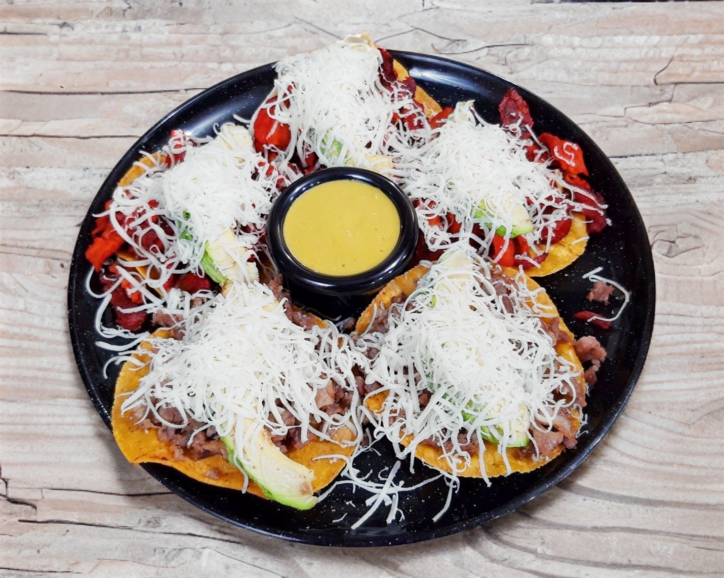 5 piezas de Carne de Trompo con nuestra Deliciosa Receta Queso Asadero Gratinado y Aguacate . Acompañado de salsa roja y Verde, limones, Cilantro Cebolla y Papitas de Galeana