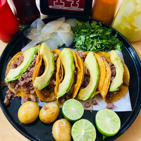 3 Taquitos de Carne de Trompo y 2 de Bistec con nuestra Deliciosa Receta Acompañado de salsa Roja y Verde, Limones, Cilantro y Cebolla y Papitas de Galeana