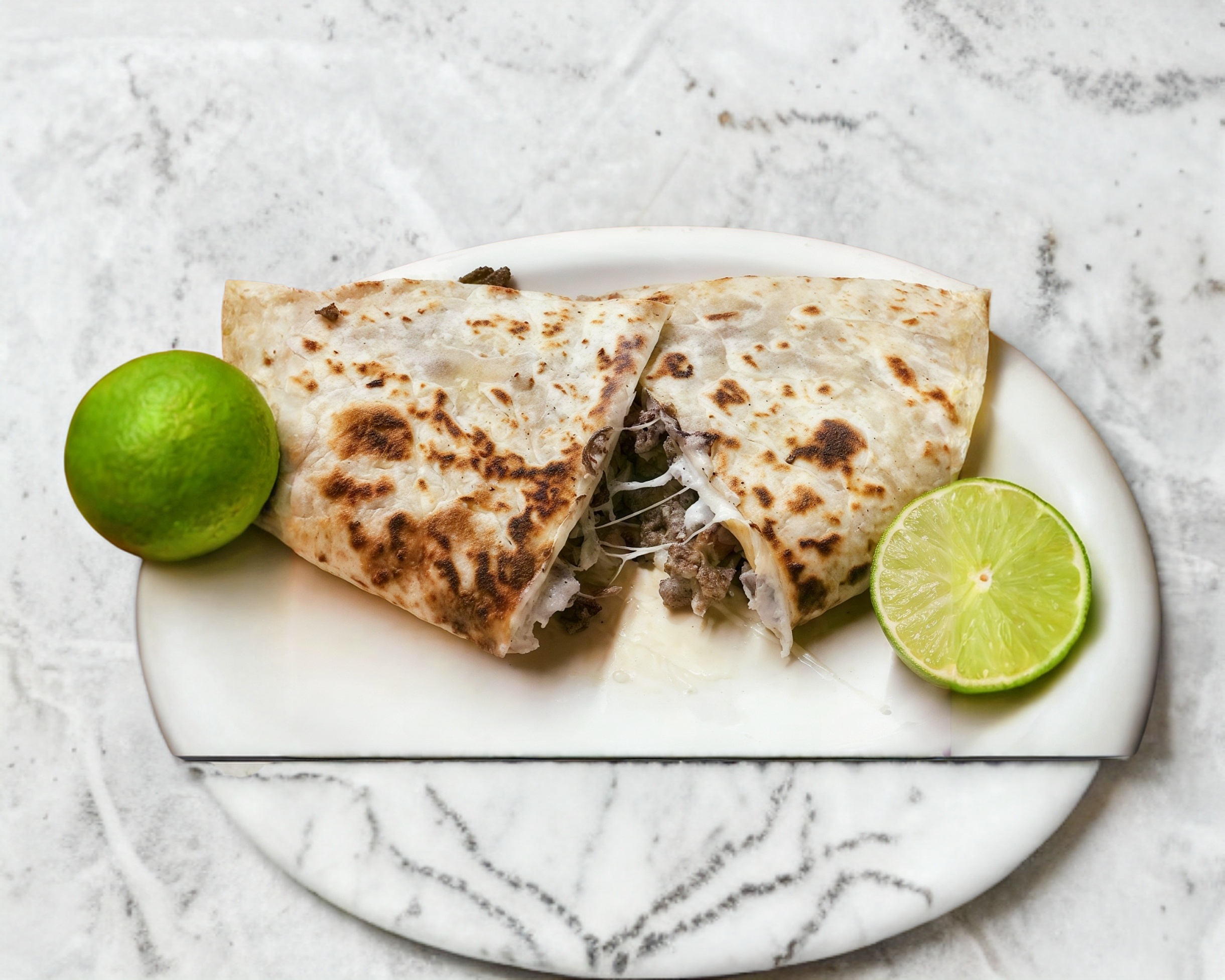 Tortilla de harina, queso asadero y bisteck