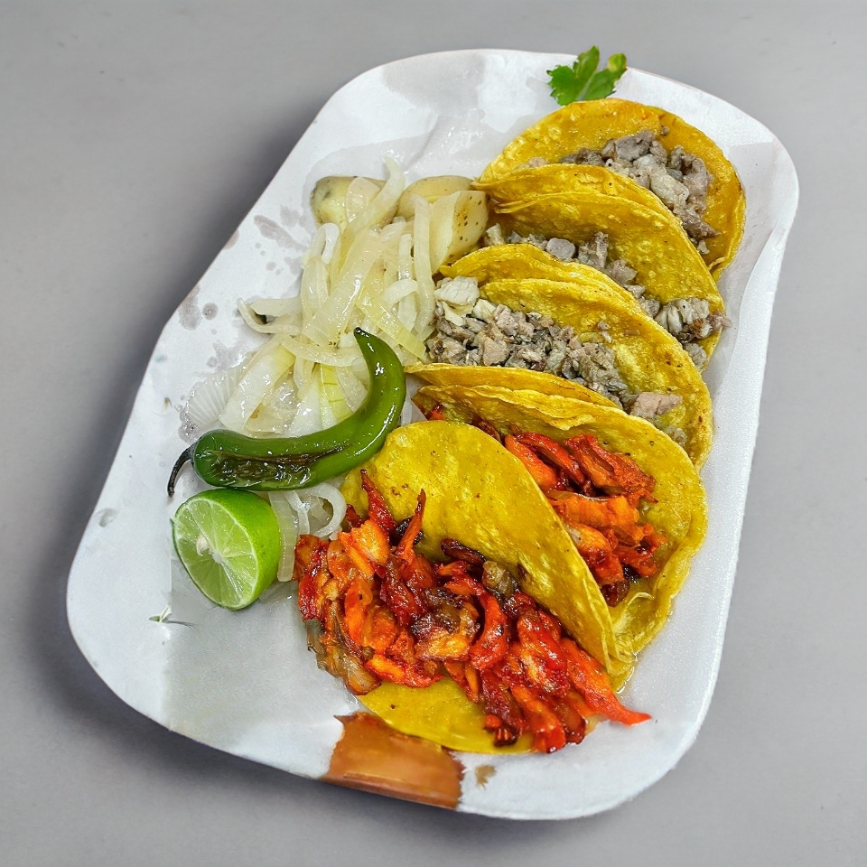 (TODOS LOS PRODUCTOS QUE INCLUYEN SUJETOS A DISPONIBILIDAD)* Tacos Carne de bisteck y trompo, acompañados con salsas, limón cebolla asada y papa Galeana, cebolla y cilantro