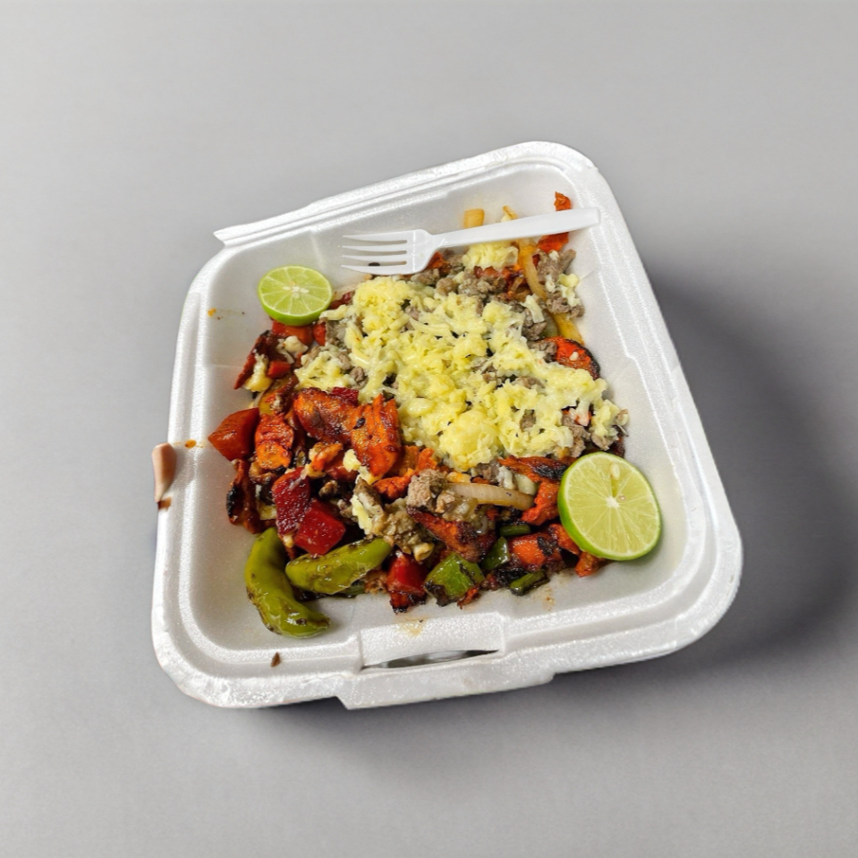 Lleva mantequilla,queso amarillo,crema,queso asadero, bistec. Incluye 4 galletas y chiles