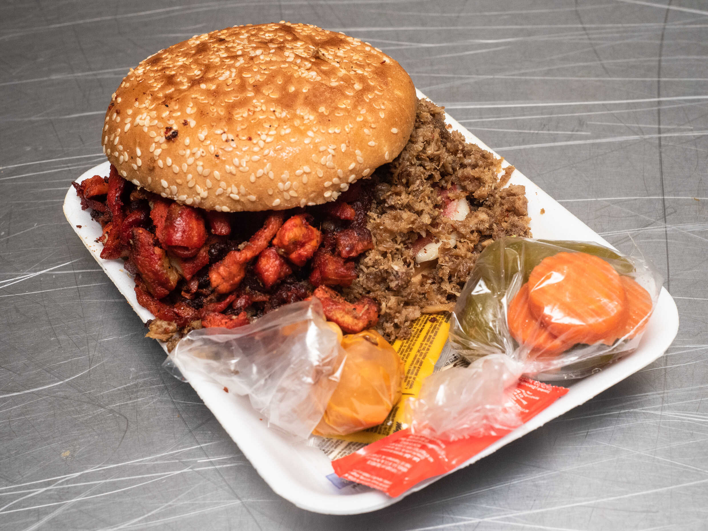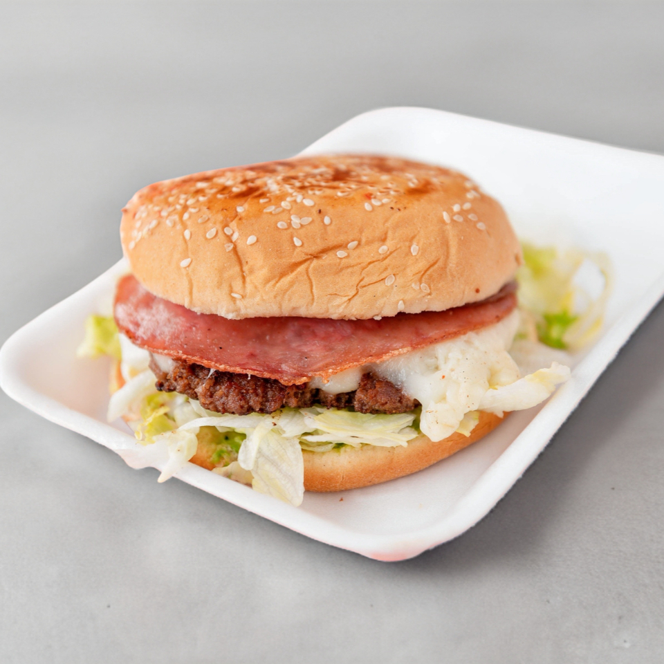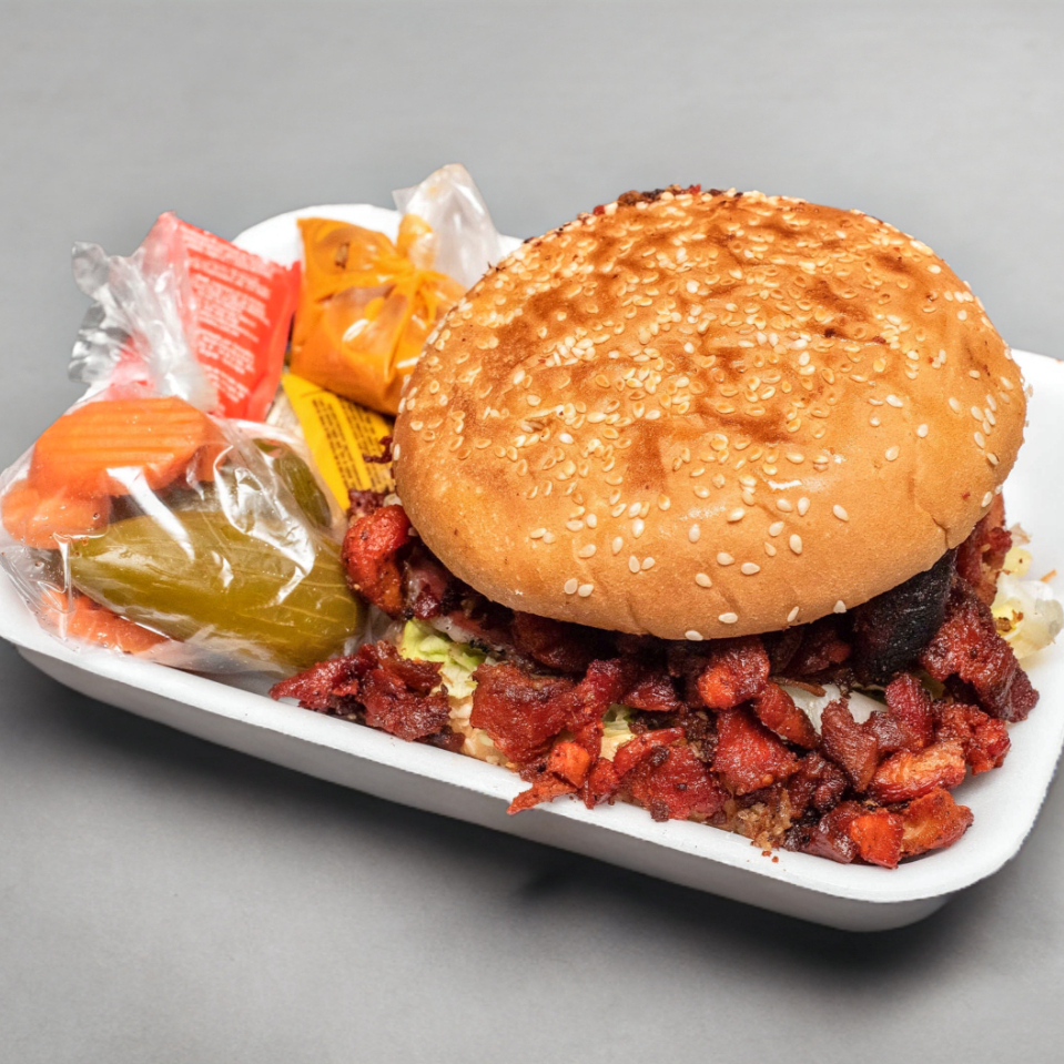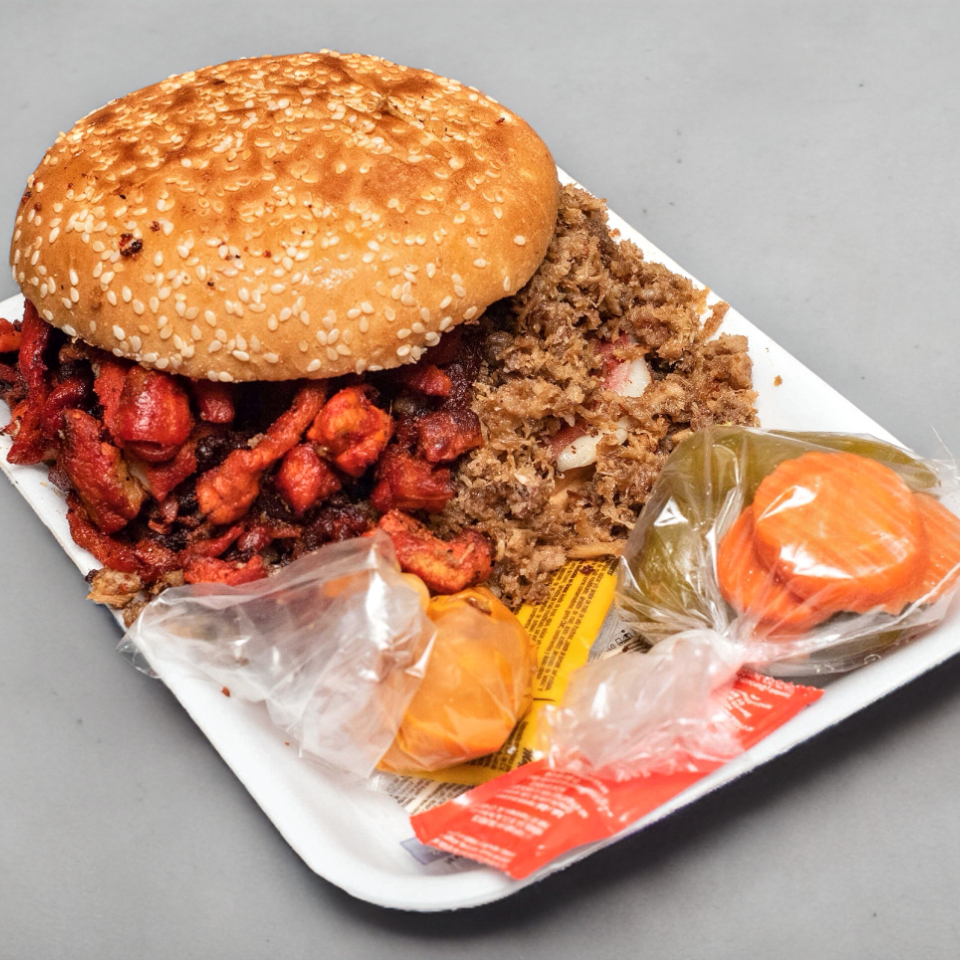 Hamburguesa de carne de res con carne de trompo y bisteck, queso, lechuga, tomate, chiles en vinagre, salsa roja y aguacate. Los aderezos los lleva aparte.