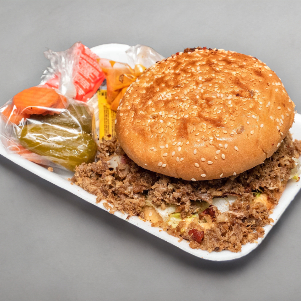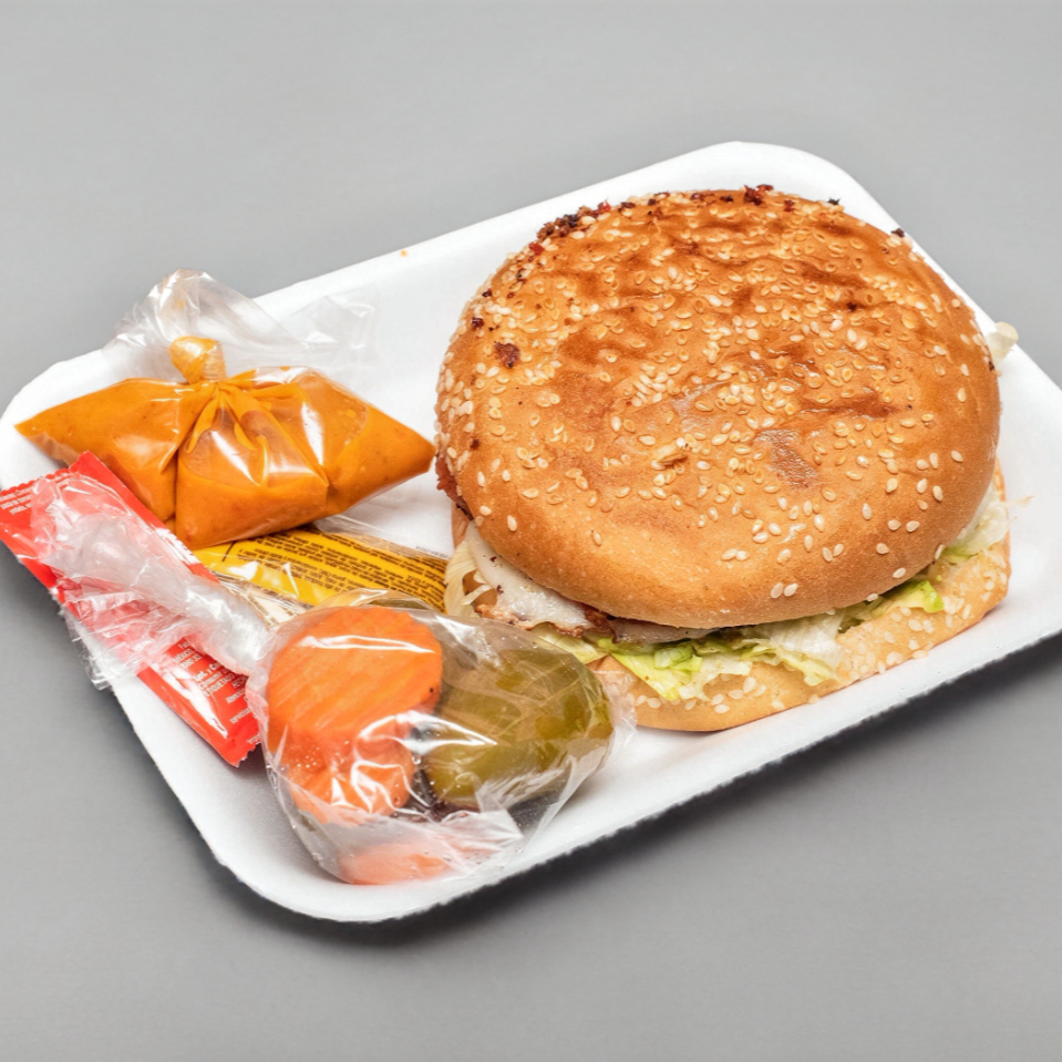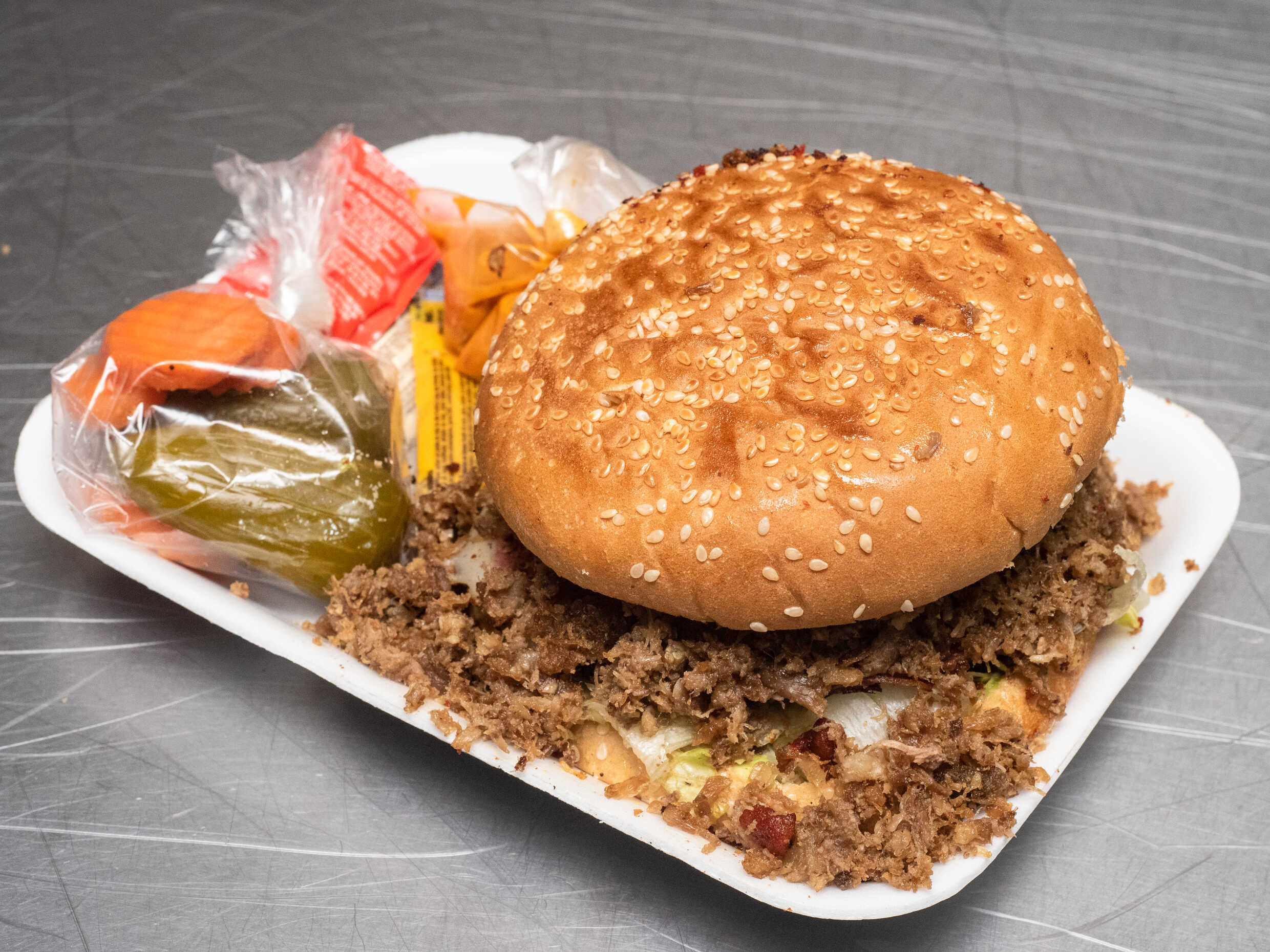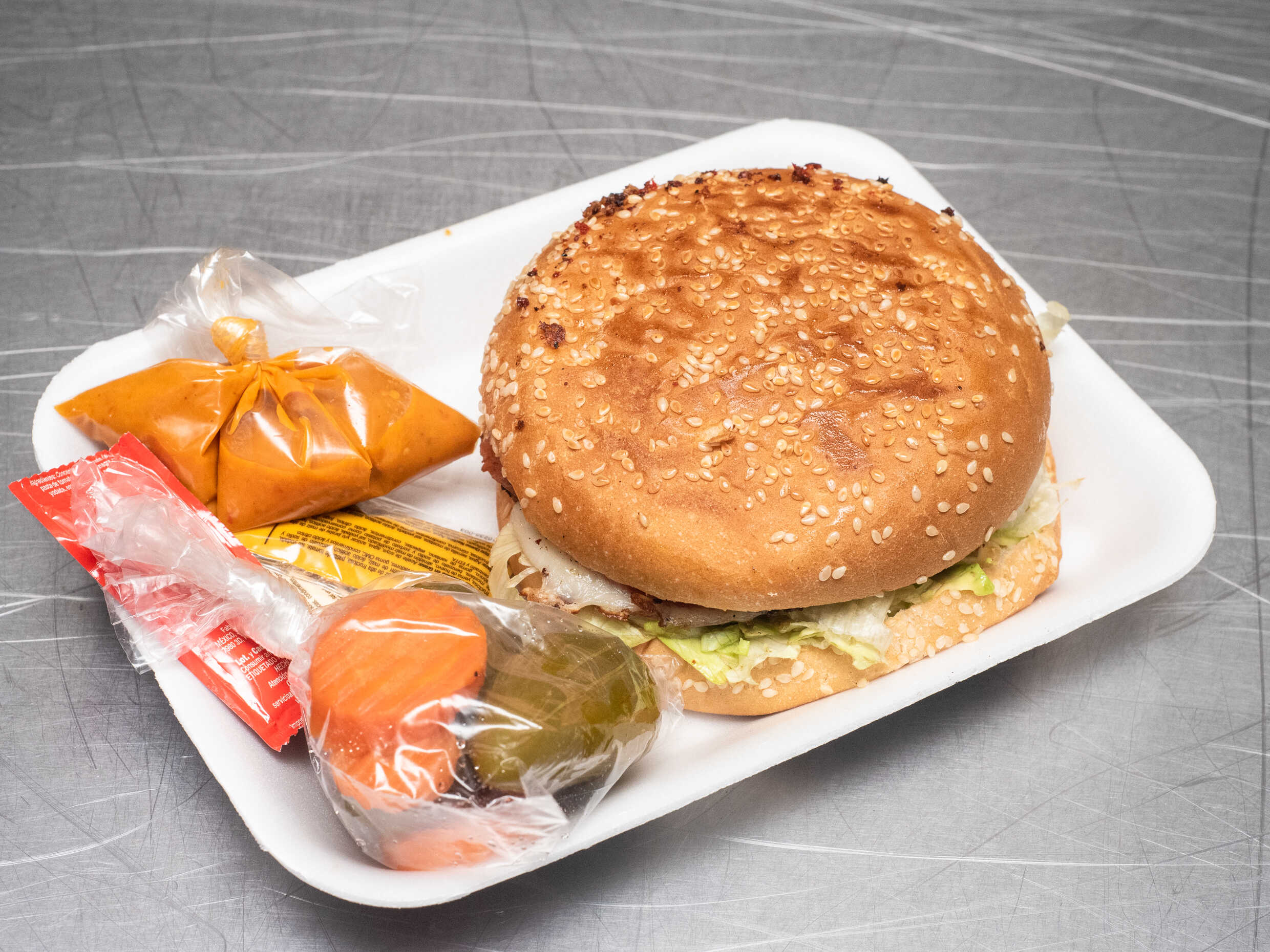 Hamburguesa de carne de res con carne de trompo y bisteck, queso, lechuga, tomate, chiles en vinagre, salsa roja y aguacate. Los aderezos los lleva aparte.