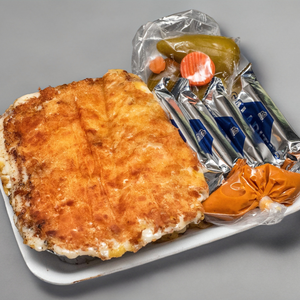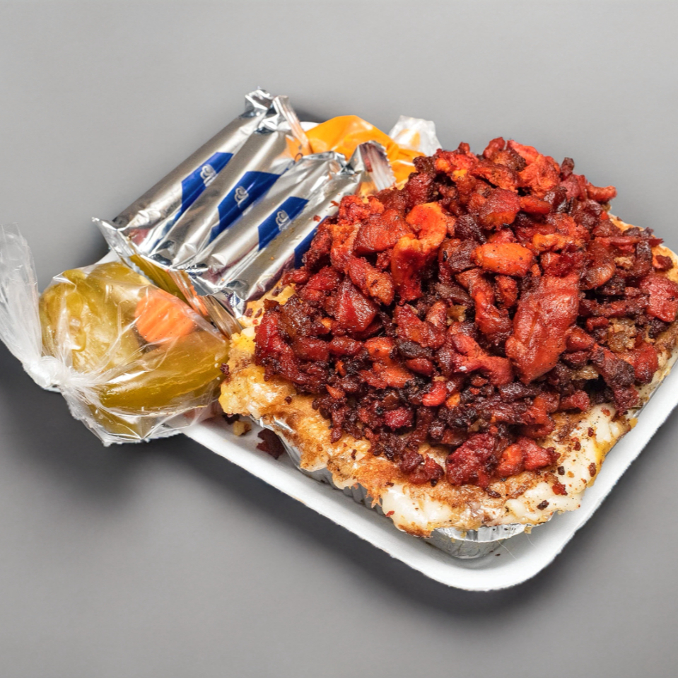 Pan de torta, lechuga, salami, queso, jamón, aguacate y carne de trompo. Acompañada con chiles en vinagre, papas de Galeana, salsa, cebolla y cilantro.