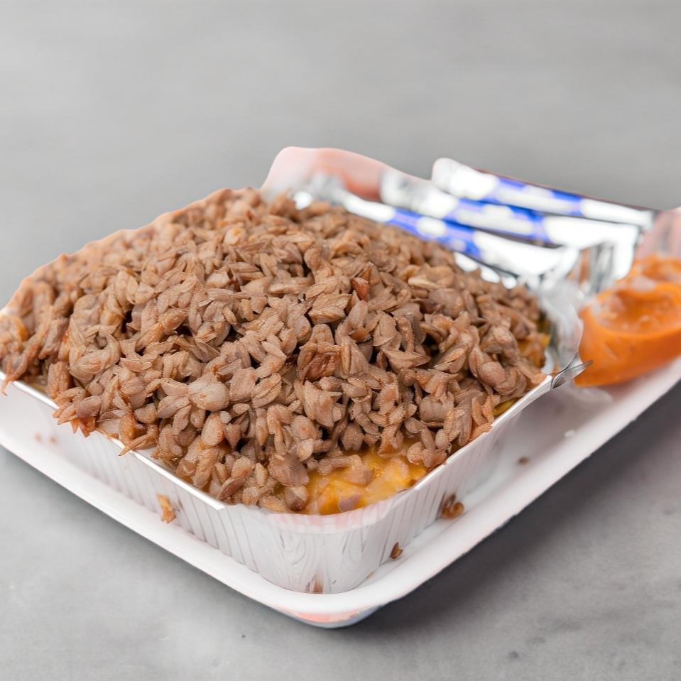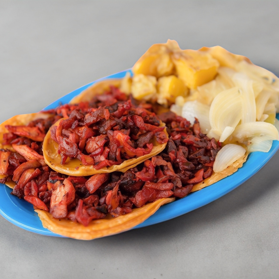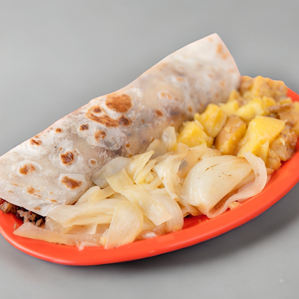 Carne de trompo y queso en tortilla de harina. Acompañada de cebolla asada, papa, limones, salsas, cebolla y cilantro.