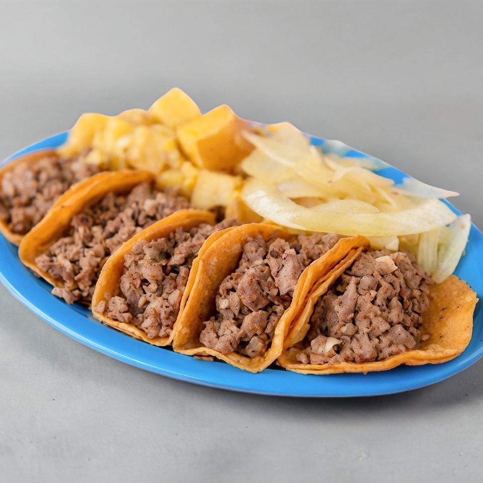 Orden de 5 tacos. Con Queso Acompañada de cebolla asada, papa, limones, salsas, cebolla y cilantro.