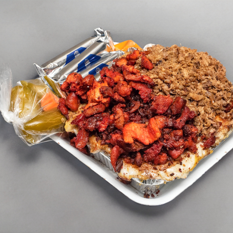 Carne de trompo y bisteck con queso en tortilla de harina. Acompañada de cebolla asada, papa, limones, salsas, cebolla y cilantro.