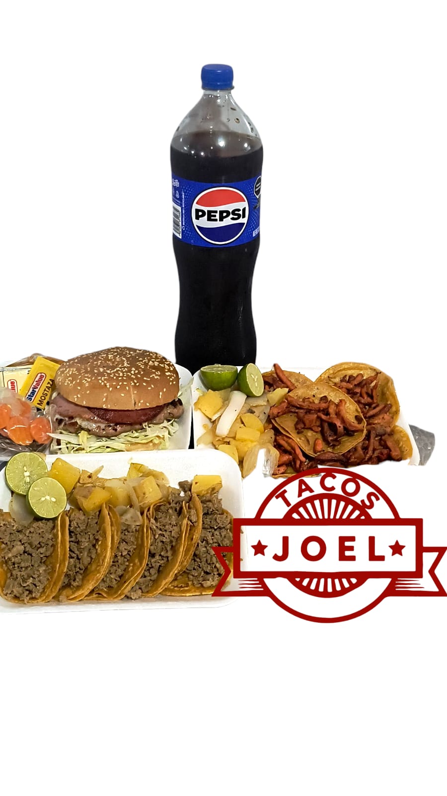 Tacos de Bistec*1 + Tacos de Trompo*1 + Hamburguesa Especial*1 + Pepsi 1.5lt*1