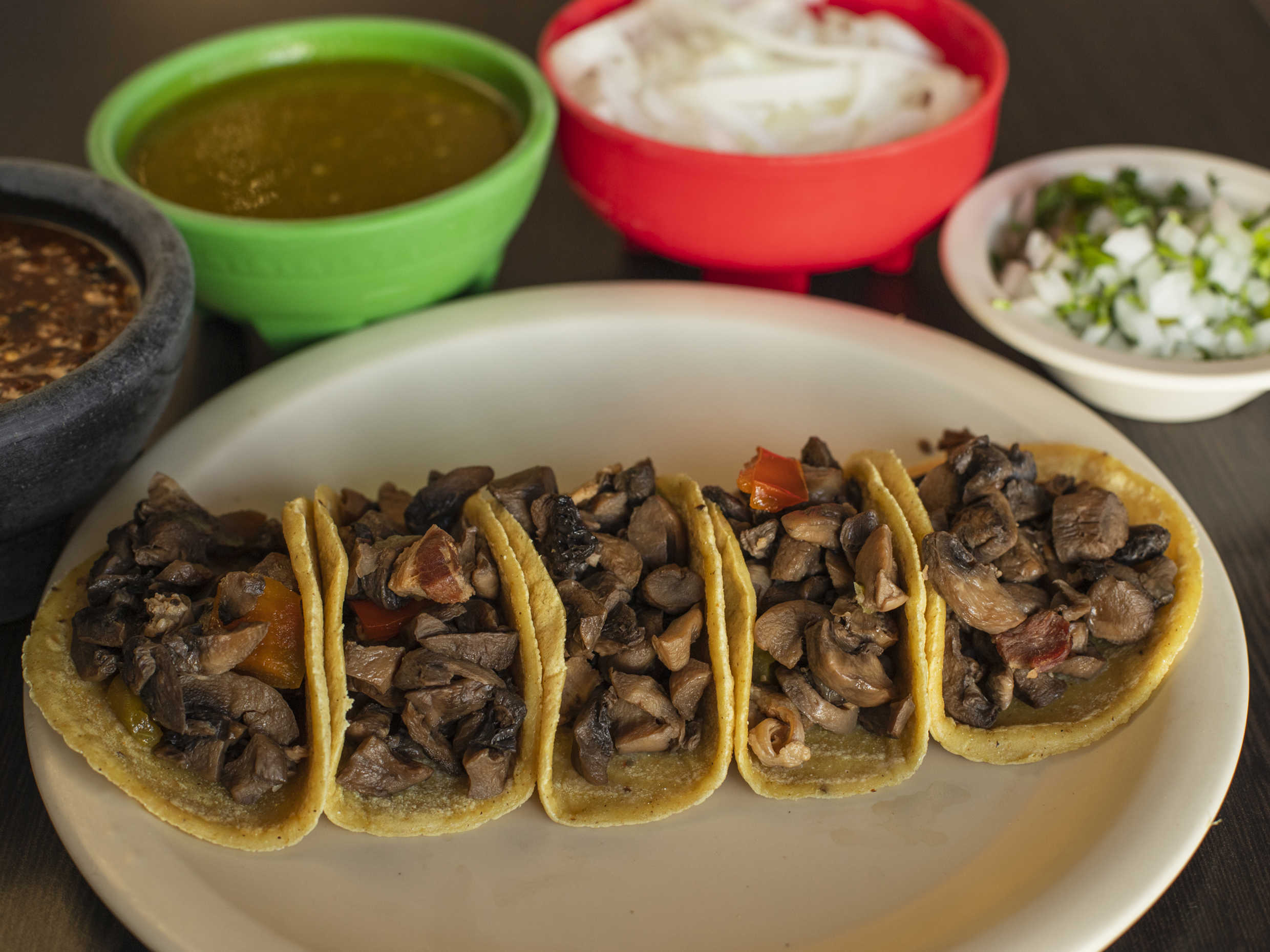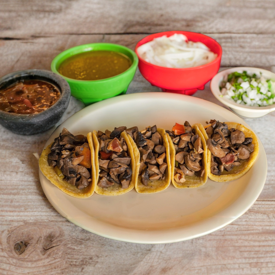 5 Piezas en tortillas de maíz recién hechas, con queso gratinado, carne de sirloin y champiñones.