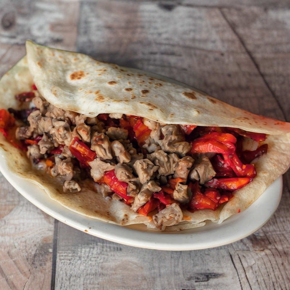 Tortilla de harina de 22 cm. con queso gratinado y carne de Sirlon.