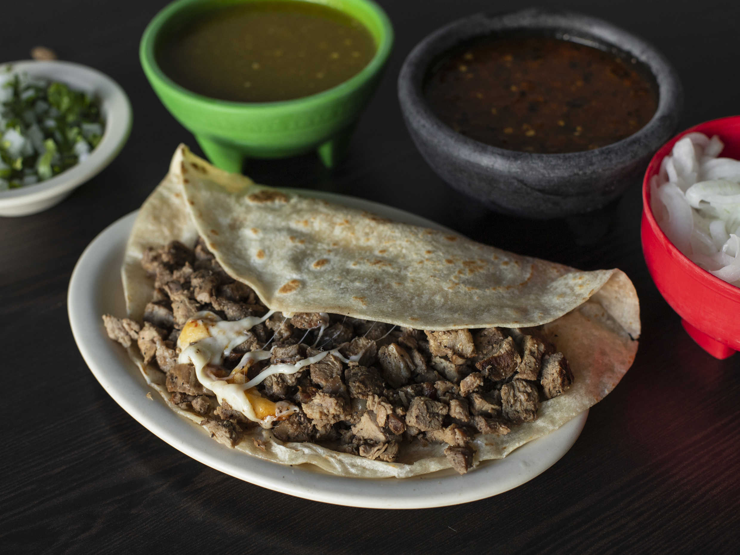 Tortilla de harina (22 cm.) con queso gratinado, carne Arrachera y Trompo.