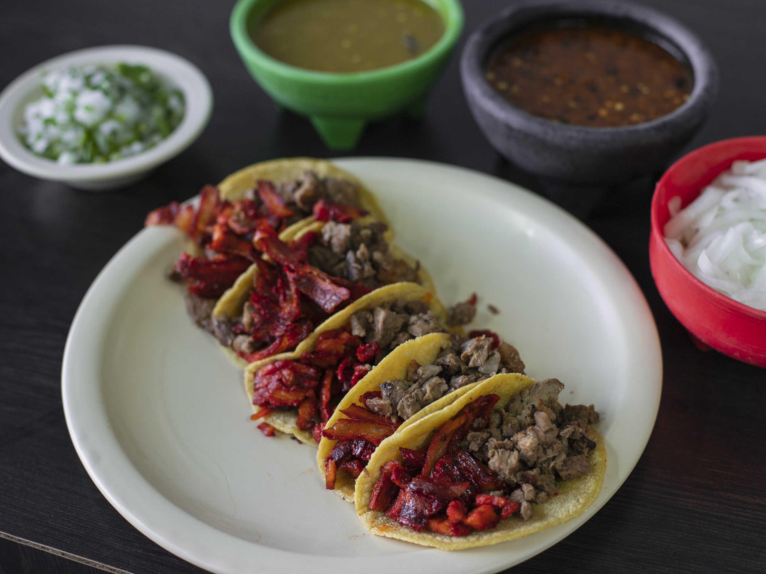 En tortilla de maíz recién hecha, 3 tacos de carne asada y 2 de trompo.