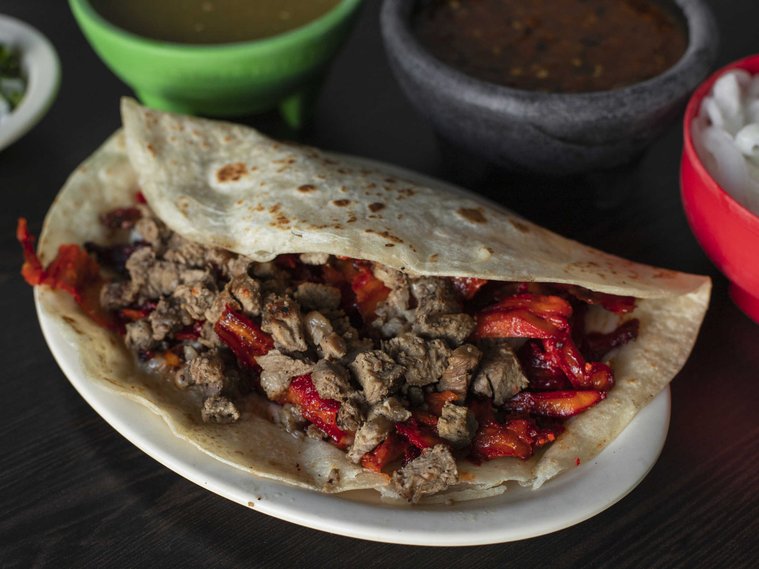 Taco individual de carne de sirlon y trompo.