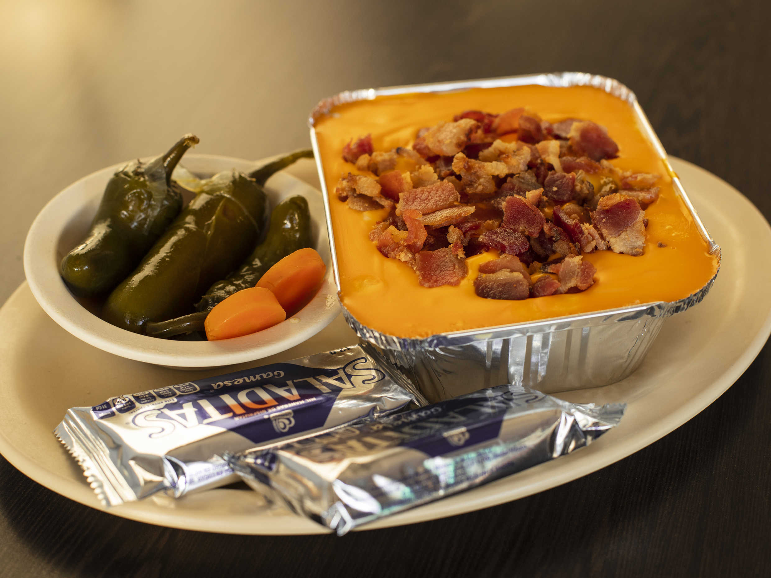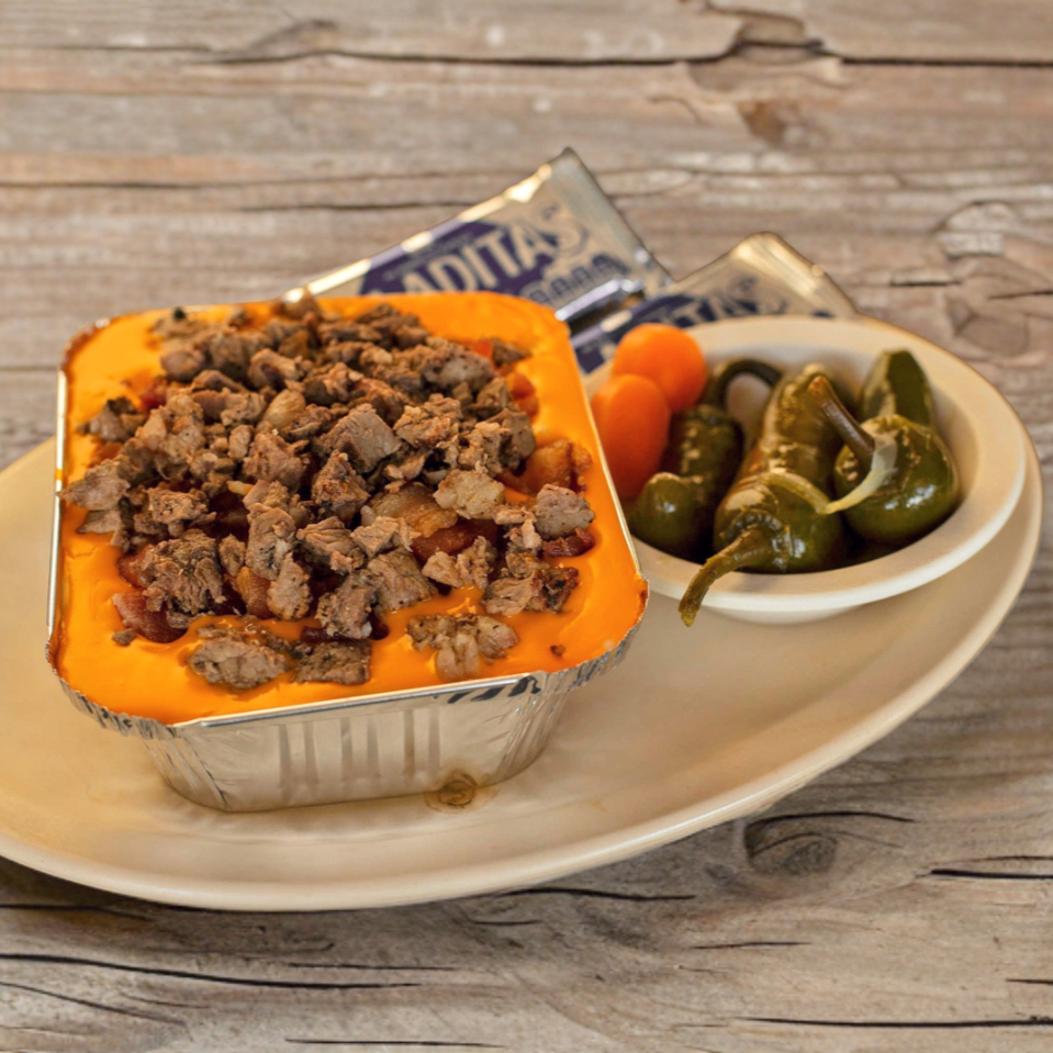 Preparada con mantequilla, queso asadero, queso amarillo, crema, tocino y carne asada (sirloin).