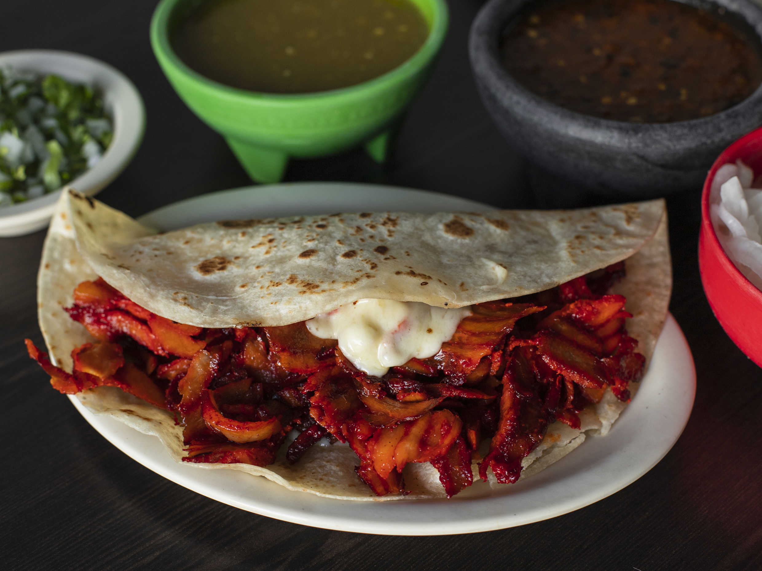 Taco hecho en tortilla de queso, con base de costra, con carne de trompo. (Aprox. 22 cm)