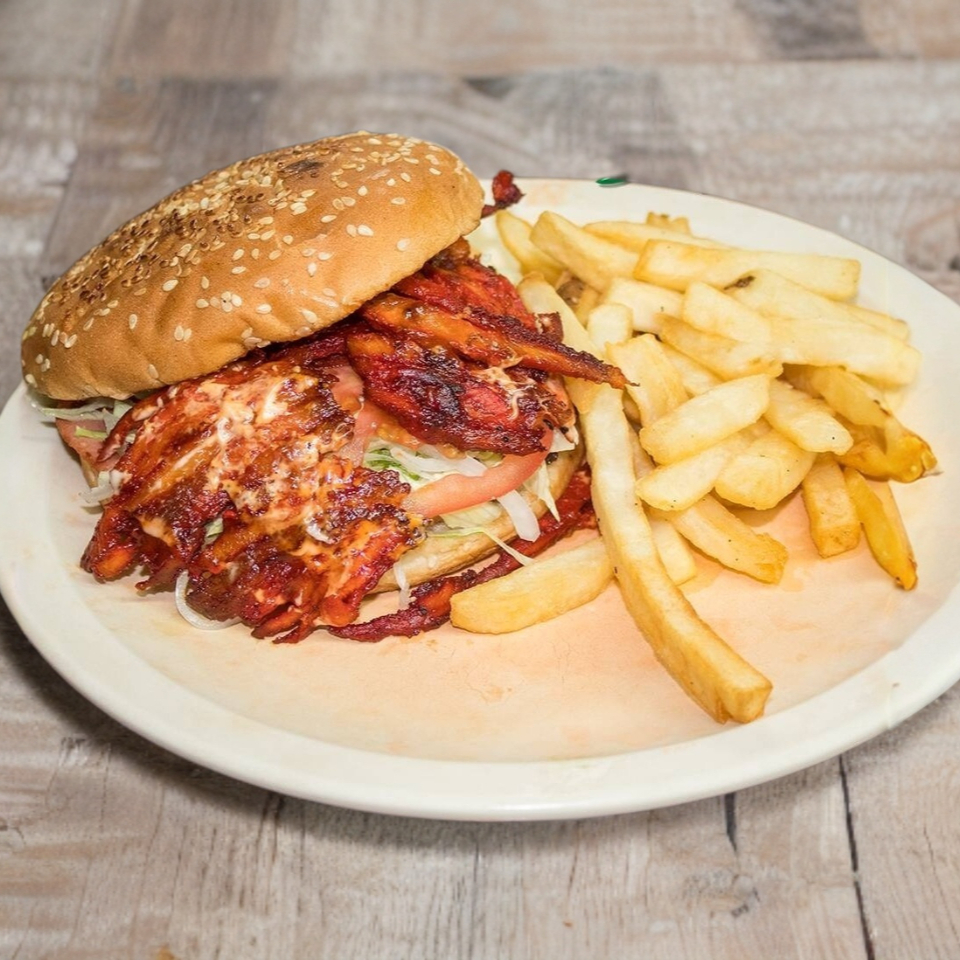 Hamburguesa con Carne de Sirlon, Carne casera, jamón, salami, queso asadero, aguacate, tomate, cebolla, lechuga, mayonesa y catsup, acompañada con papas a la francesa y chile en vinagre