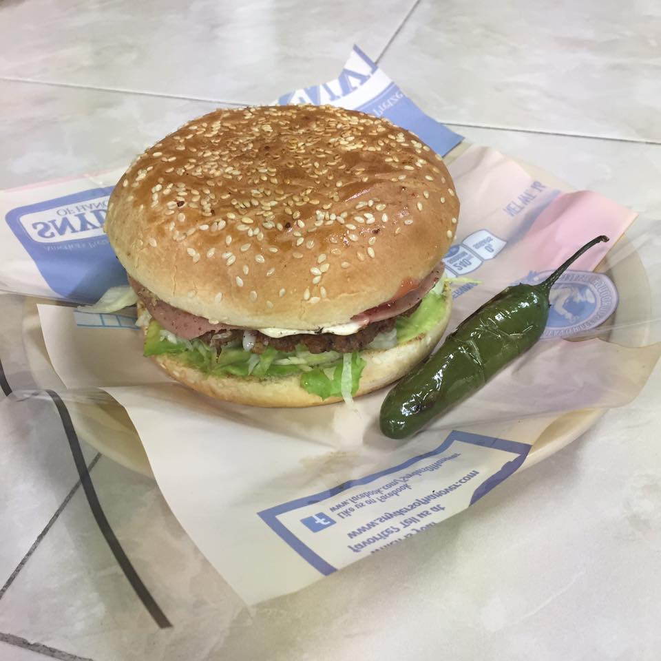 Carne de res, lechuga, jamón, queso, aguacate, mayonesa y cátsup.