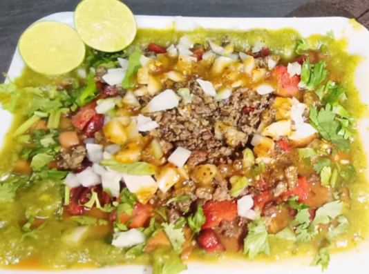 Incluye: frijoles charros c/ carne y salchicha asada, pico de gallo, todo esto bañado de salsa verde y roja incluye tortillas (10 )
