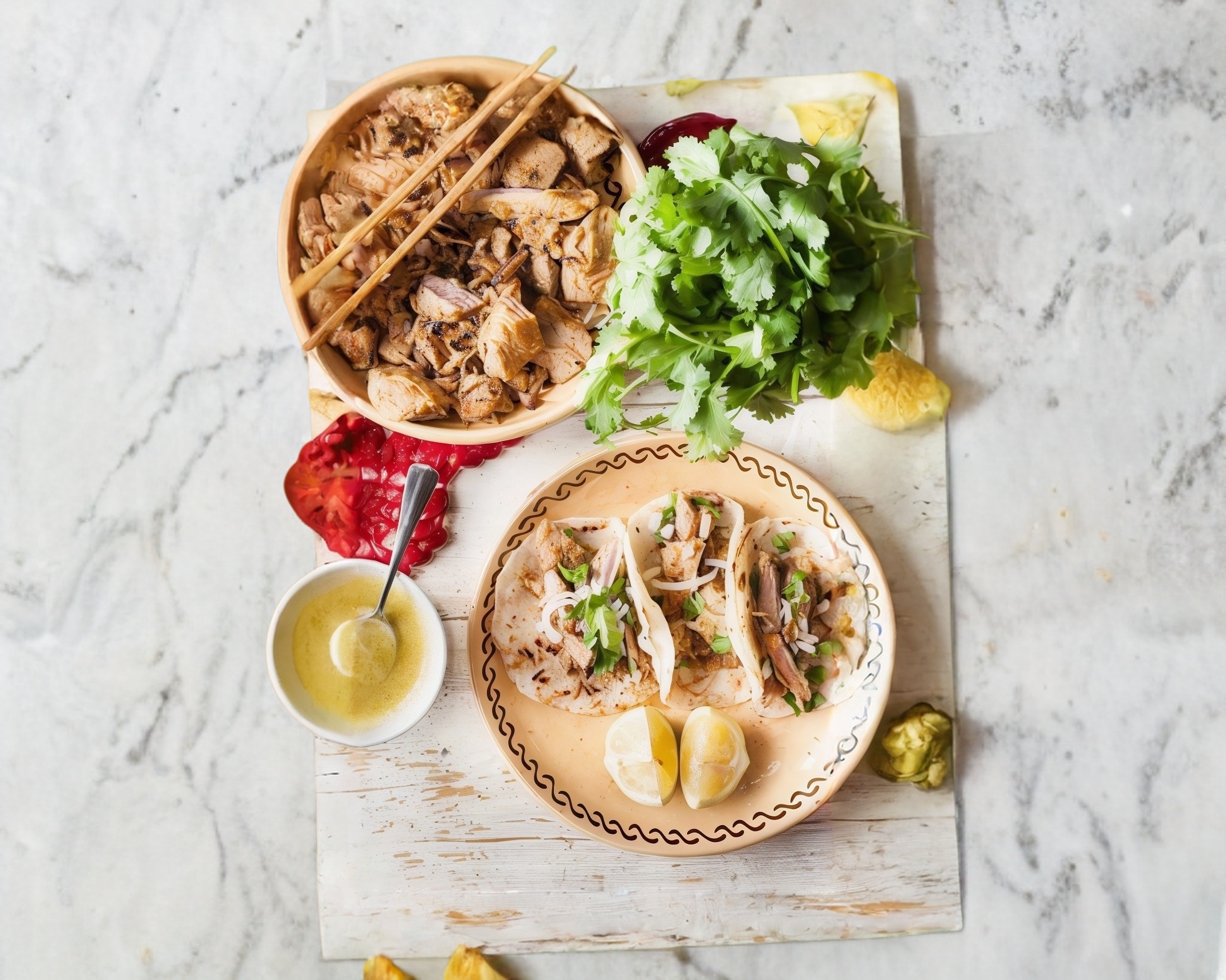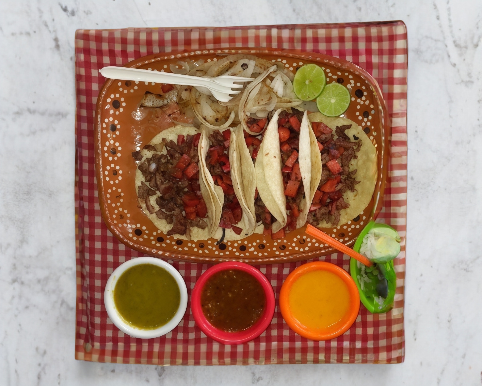 5 Tacos de carne asada, tortilla de harina o de maíz, cebolla asada, salsas roja y verde, limón