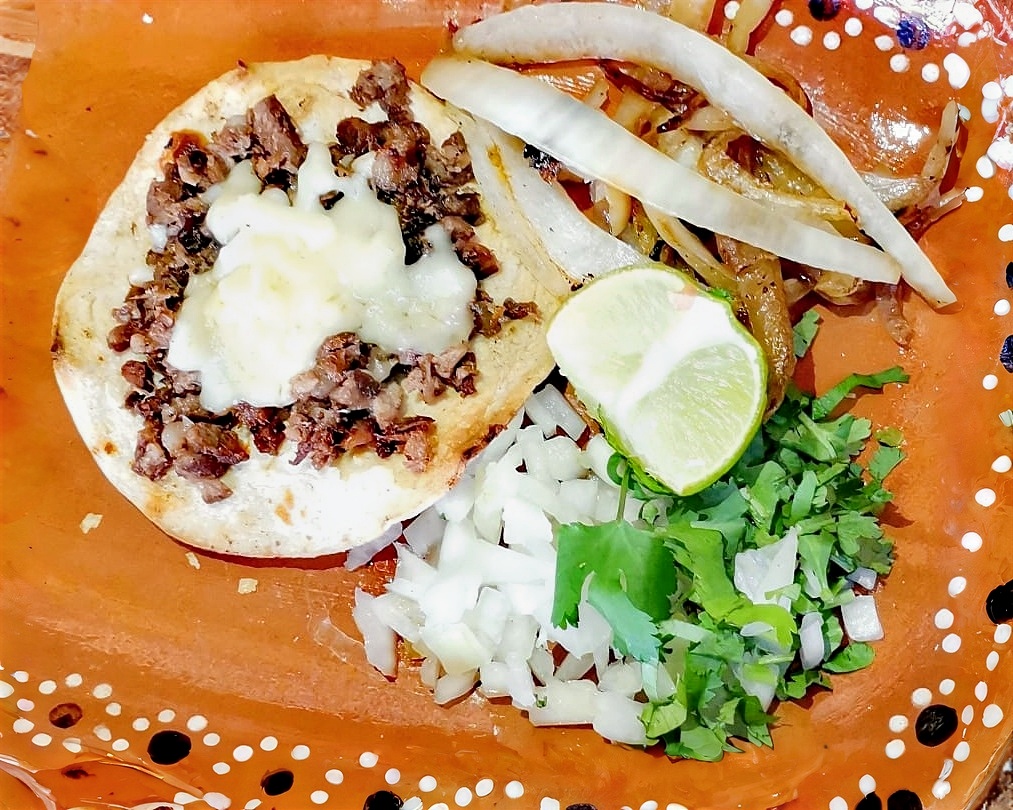 Tortilla a su elección, queso asadero, carne asada, incluye cebolla asada, salsa y limón