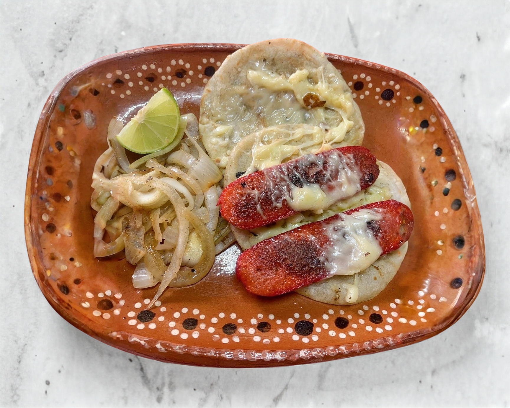 Un empalme de Longaniza, incluye cebolla asada y salsa verde y roja