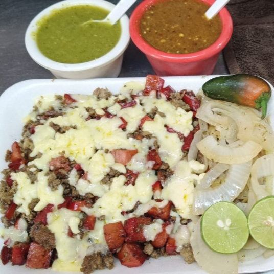 Ingredientes: salchicha y carne asada, gratinado c/ queso asadero , acompañado de cebolla asada , tortillas (10) salsas y limon