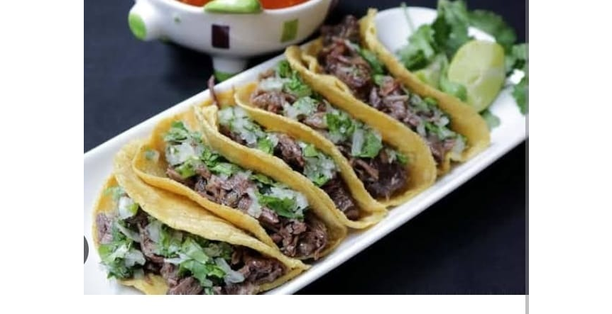 5 tacos de barbacoa en harina o maíz, incluye salsas roja y verde, cilantro con cebolla y limón