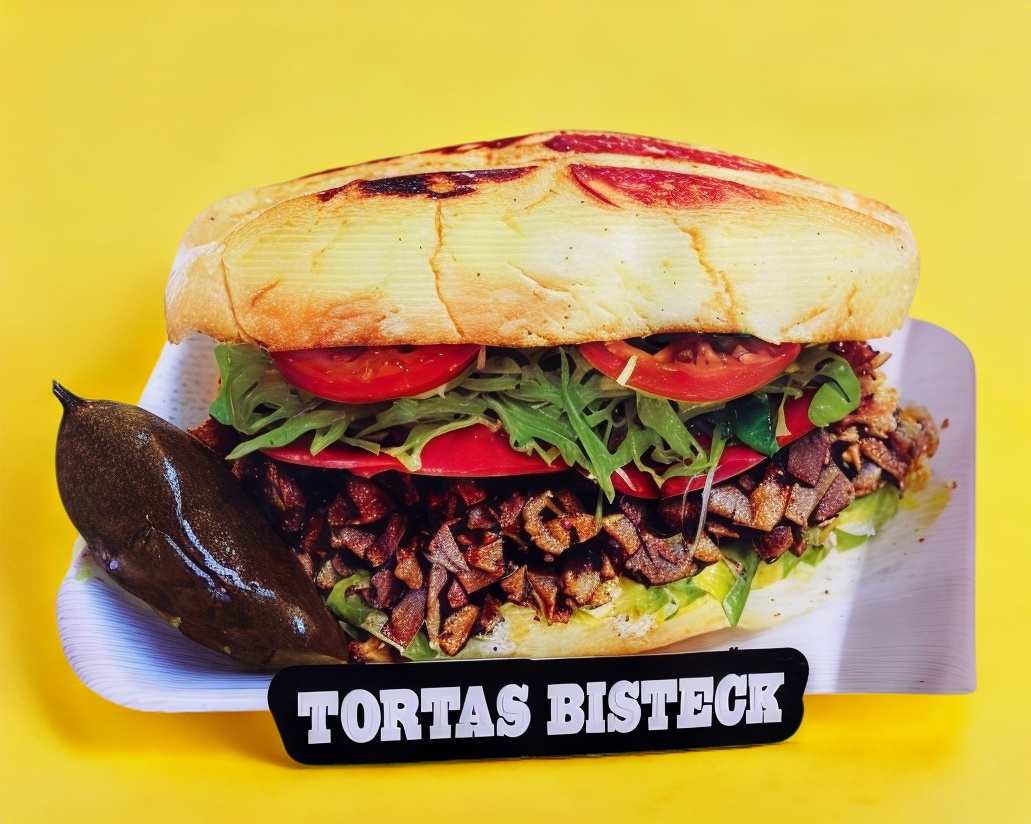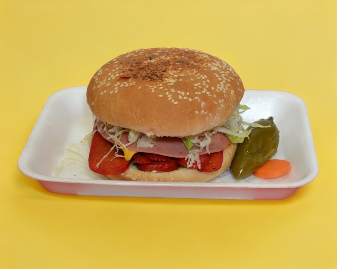 Carne de bistec, queso asadero, crema, jamón, lechuga, aguacate, tomate, cebolla, mayonesa y chile vinagre.