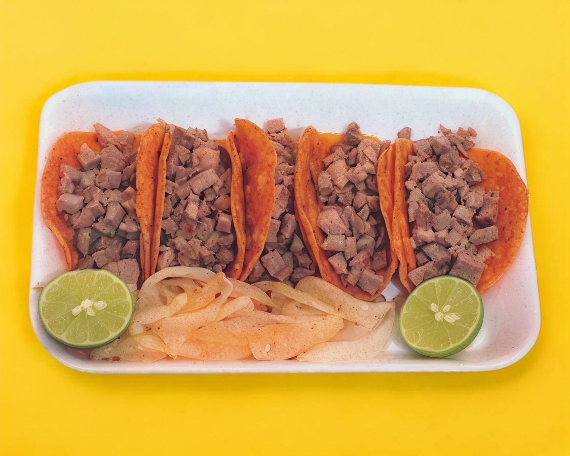 Tortilla de maíz, carne de de trompo, bistec acompañado de su salsa cebolla y limón.